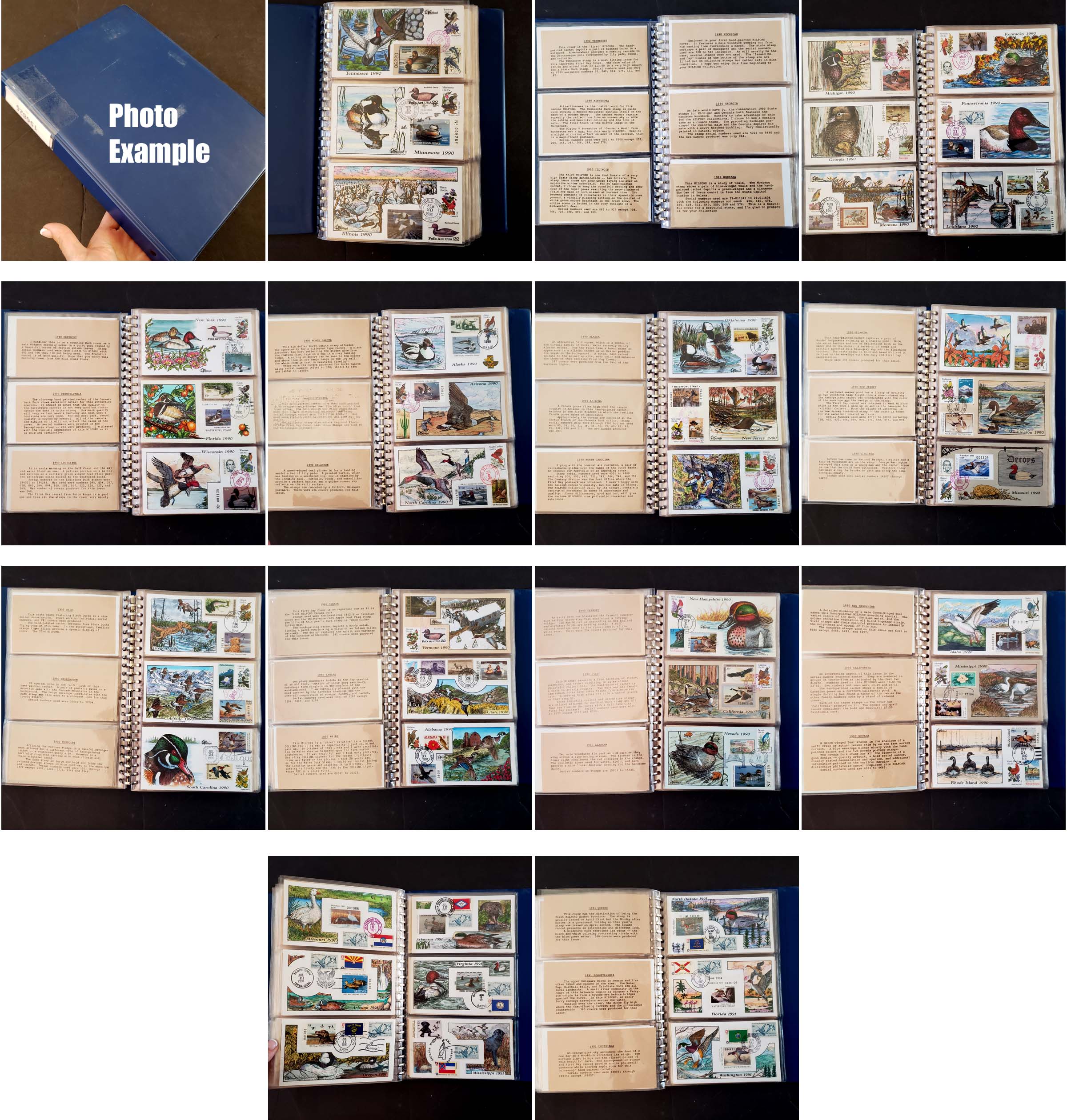 18 imageCOLLECTION OF MILFORD HAND PAINTED STATE DUCK FDC'S, includes 75 mostly different handpainted FDC's by artist K. Milford, most are combination covers with various U.S. postage stamps, most of the states are here with various State Ducks, the overall condition is very clean, contained in a cover album, this particular artist is very colorful and extremely detailed in their work, average retail for this artist is generally in the $30-50 range with some much higher, a great looking lot.