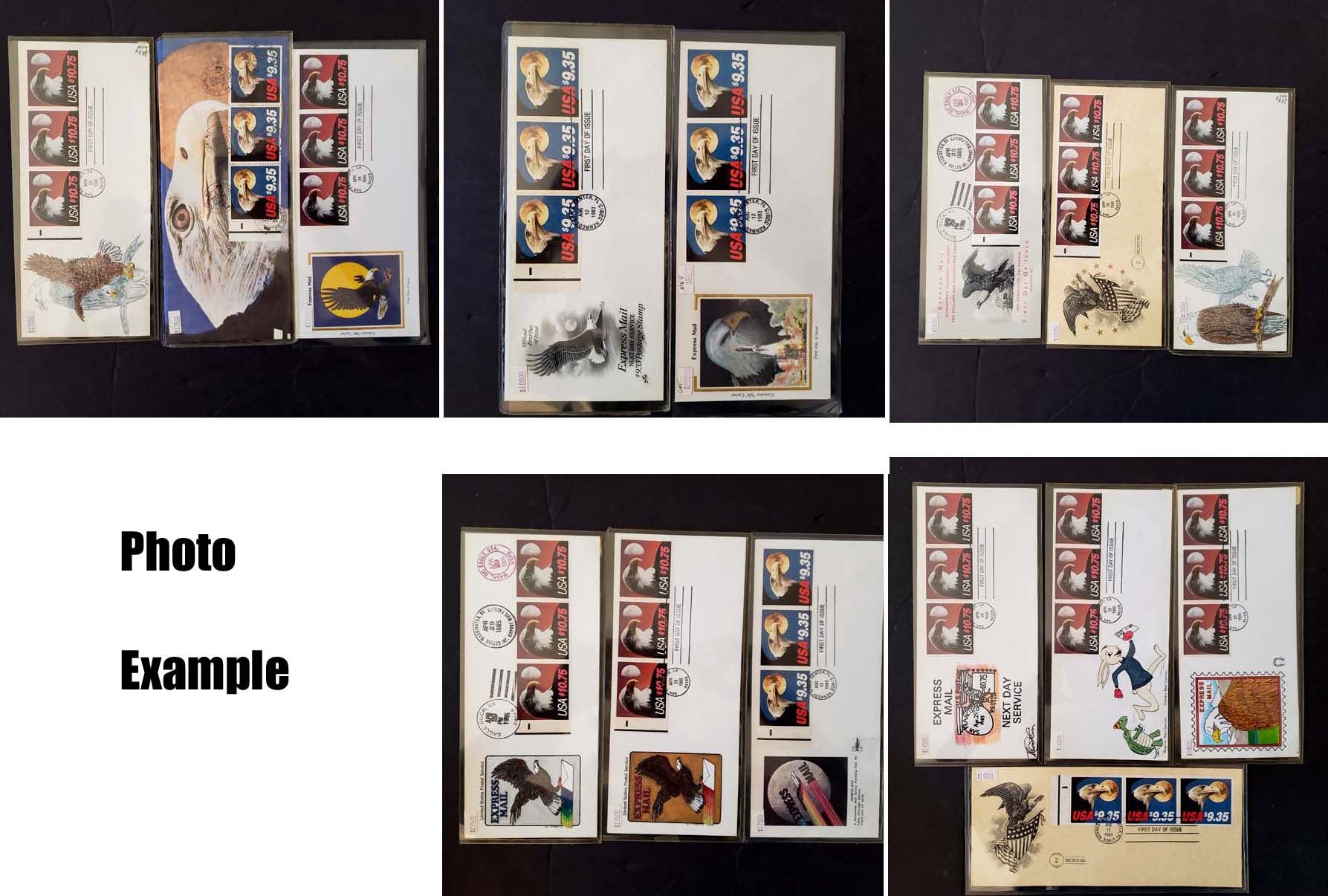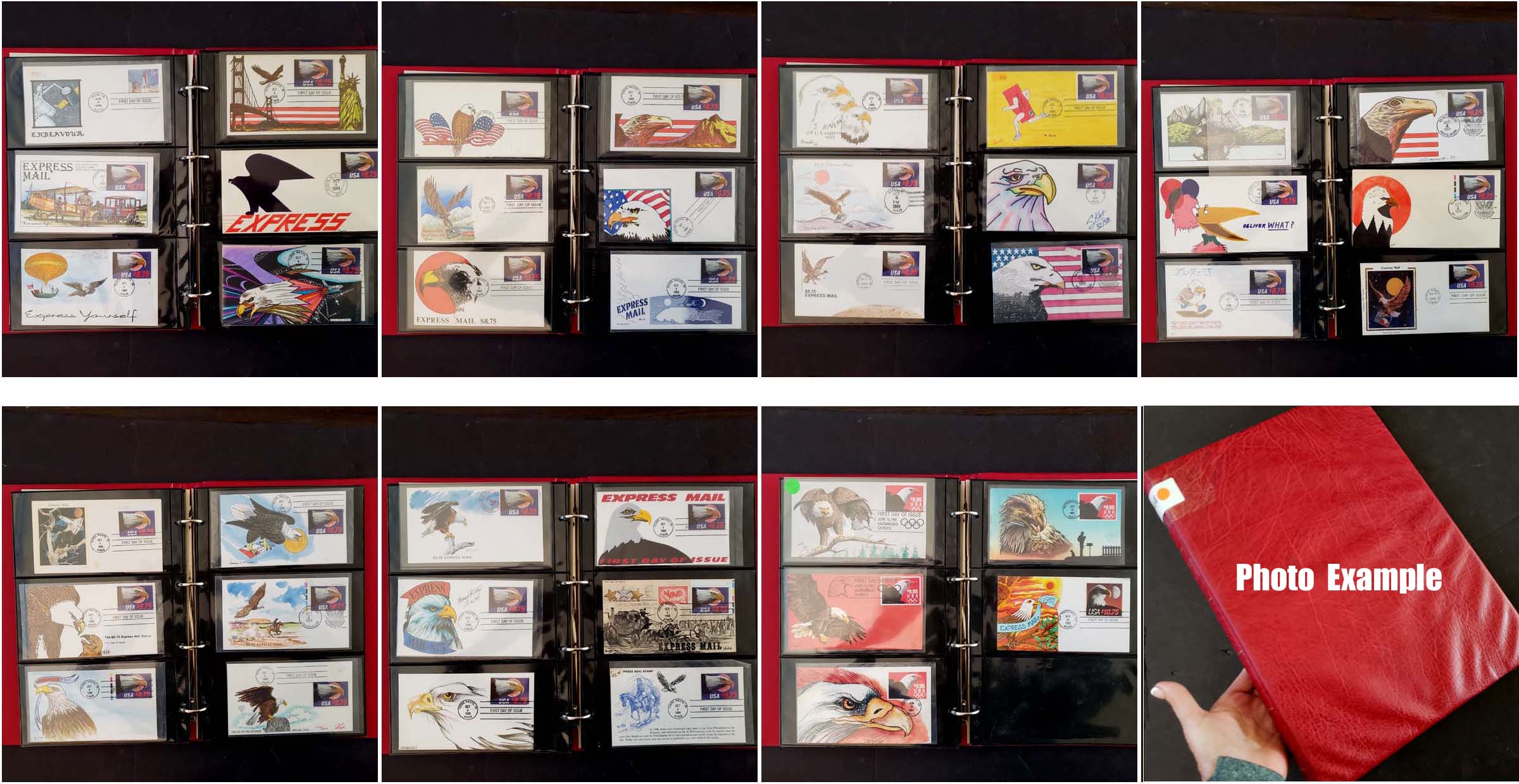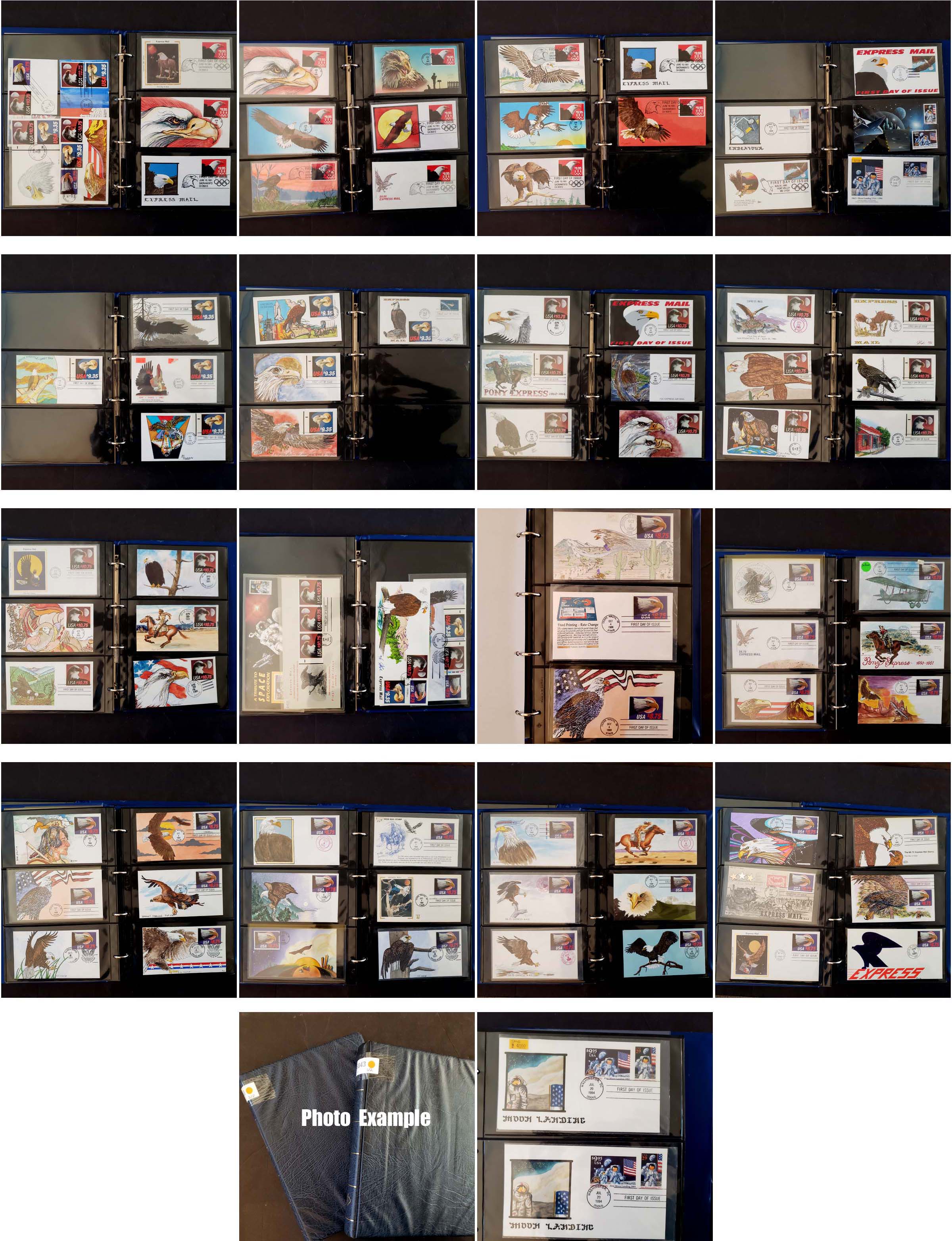 3 imageEXTENSIVE EXPRESS MAIL HANDPAINTED FDC COLLECTION, includes 138 different covers, contained in two cover albums, virtually all are handpainted with a few Colorano covers included, many various artists here for the four issues, the overall condition is very clean with maybe a scattered fault, the collection includes: $8.75(79 different), 9.35(8), 9.95(14), 9.95 Space(2), 10.75(19), 14.00(2), combos(6), large covers(8, some with full panes); many of these covers retail in the $50-100 range and some of the better covers are over $200 each; a simply amazing number of these very popular covers, without question the largest number of different handpainted Express covers we have ever offered, the retail value of this collection is easily well over $10,000 especially if acquiring them one-by-one which would take many years, certainly a very rare opportunity to jump into this area with a huge number of different covers.