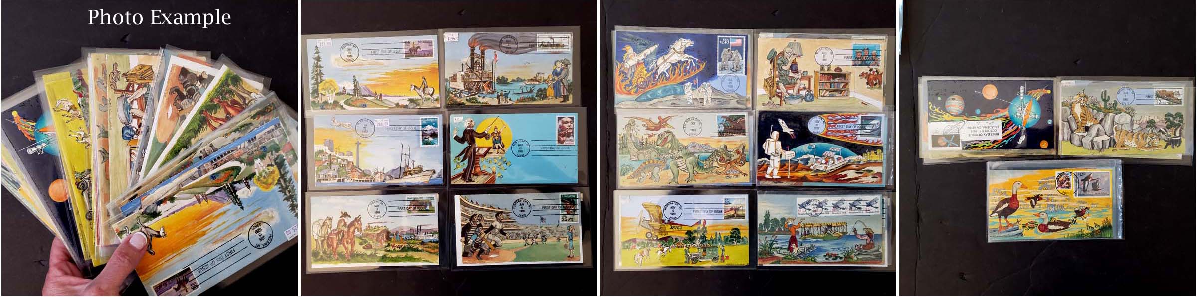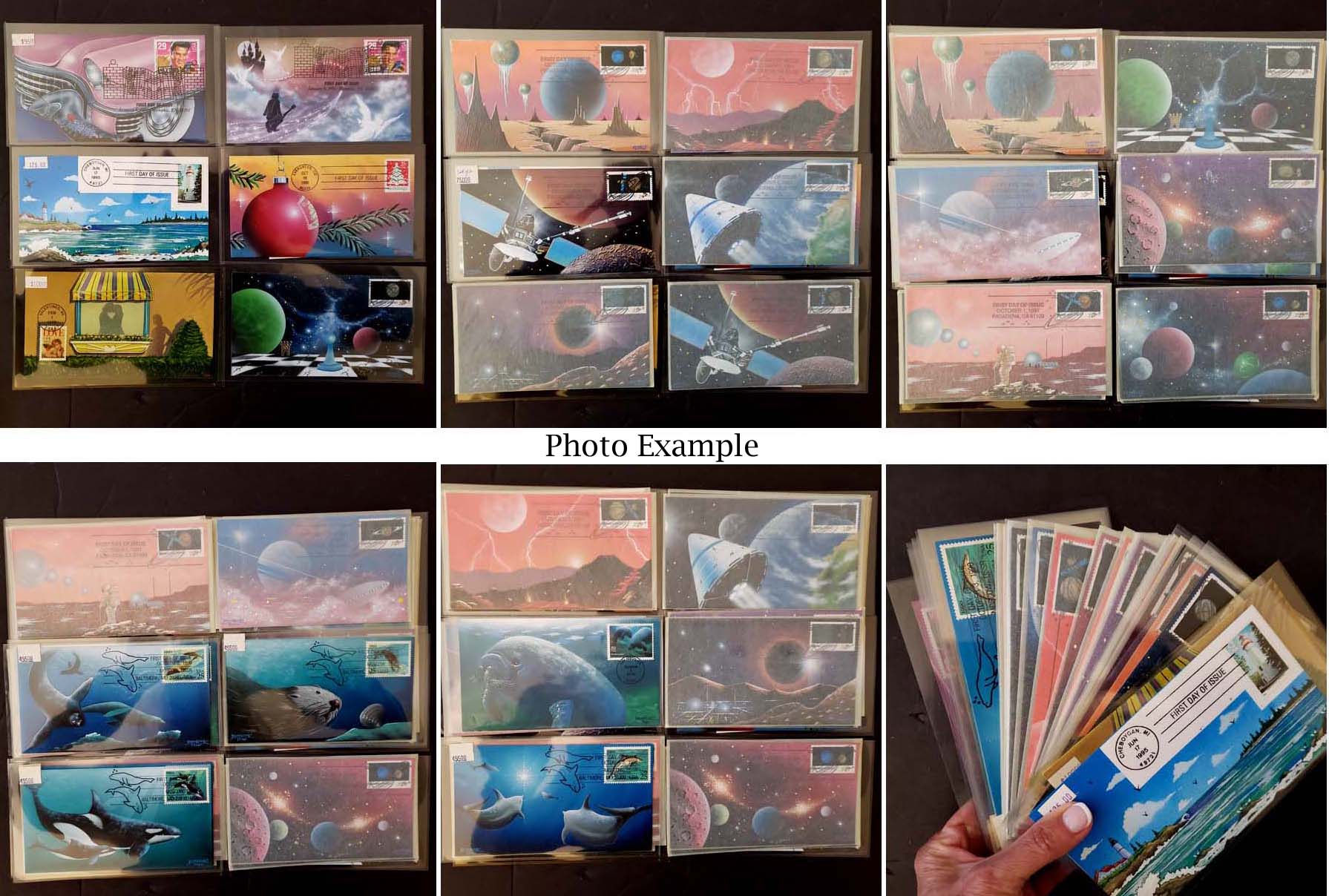 9 imageU.S. HANDPAINTED FDC ACCUMULATION, includes over 250 various covers, in poly and plastic, loose in a large flat box, many different issues here, many different artists and designs, overall exceptional variety but there are some duplicates scattered, the general quality is very clean but there many be a few faults her and there, many of these covers would retail in the $20-30 range and some up to $50 or more, a very attractive selection and certainly a huge amount of potential retail value here.