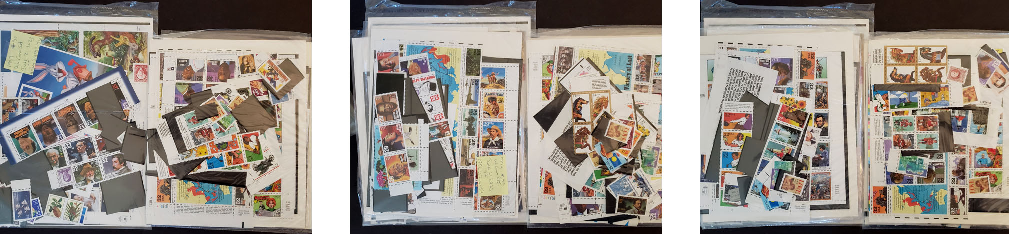 221 imageU.S. FACE MIXTURE, includes hundreds of singles, blocks, plate blocks, S/S's and some booklets, contained in a flat white box, there are 15 sets of Ameripex S/S's, good variety but expect some duplication, also some mixed condition due to handling, Total Face = $615.00 (Image)