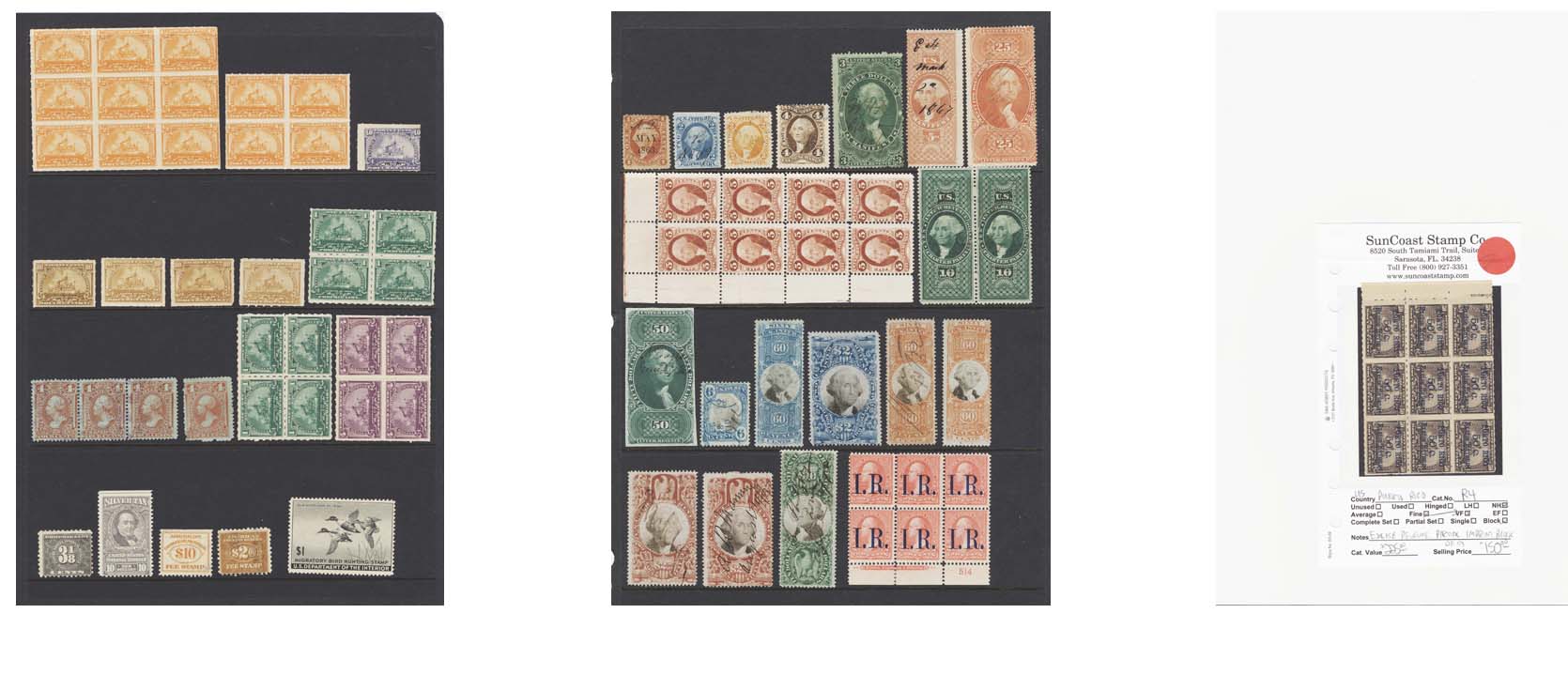 272 imageU.S. REVENUE GROUP OF BETTER ITEMS, includes a couple dozen mint and used singles, pairs and blocks, arranged on black stock pages, good variety but there is some duplication, the overall condition is mixed and there are faults to be expected, most have values in the $100-300 range, some of the better items are: R2c(printed cancel), 13b, 20d, 100d, 101a, 108, 116, 142(2), 146(2), 149, 170*NG, 172*(2), 172*NG(2), RB24p*(Blk/4 x2), 39*, RG125 NH, RK7, 28, RW12 NH, Puerto Rico R4 NH(Blk/9); virtually all the items here were purchased individually online over many years, some good value here.