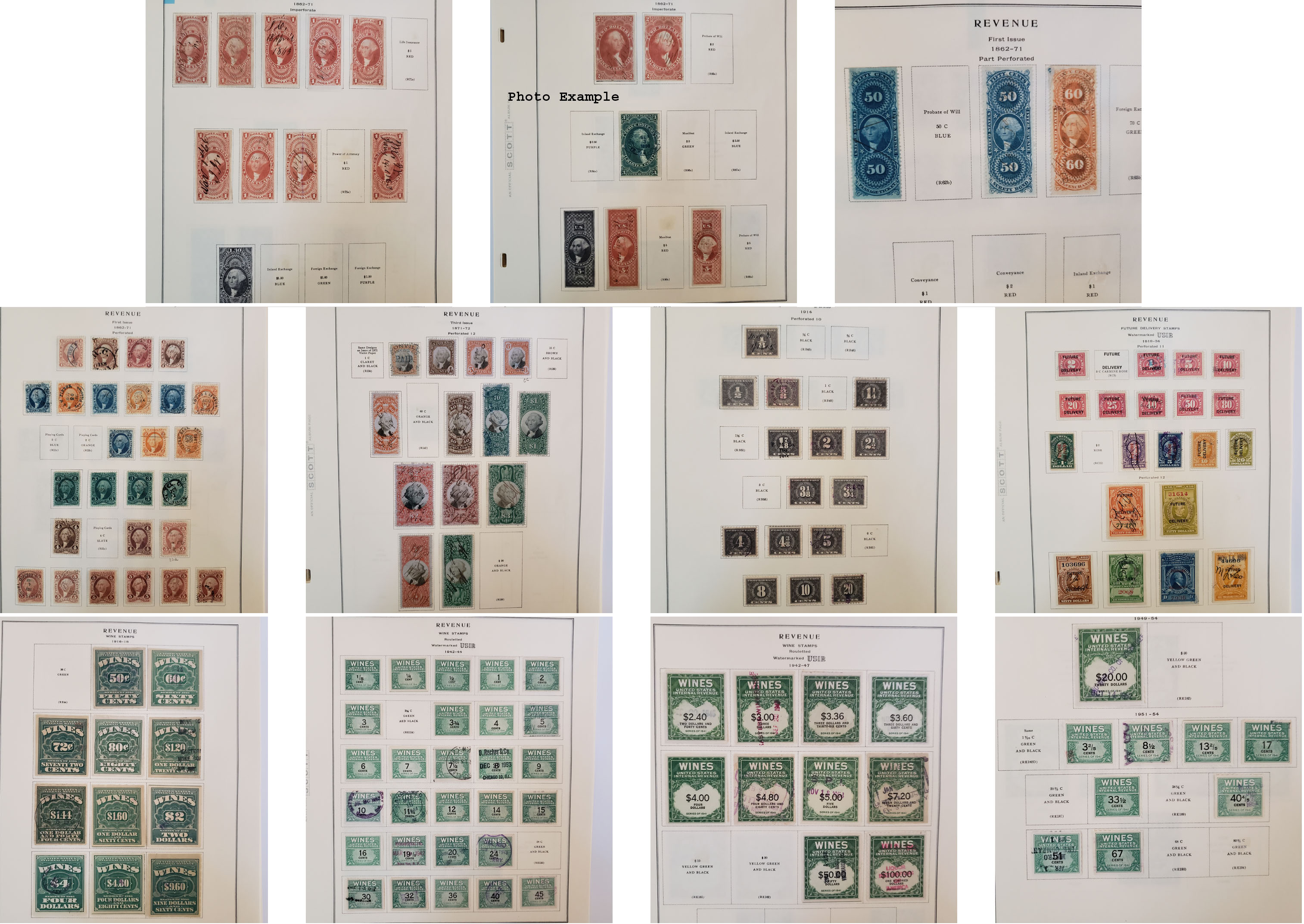 280 imageU.S. REVENUE COLLECTION, includes several dozen mostly used, mounted on Scott album pages, there are some Props, Future Delivery, Stock Transfers, Wines and Silver Tax, much of the value here is in the Dated Greens where virtually all are uncut, maybe a few scattered faults, values up to about $50 with a few higher, take a look.