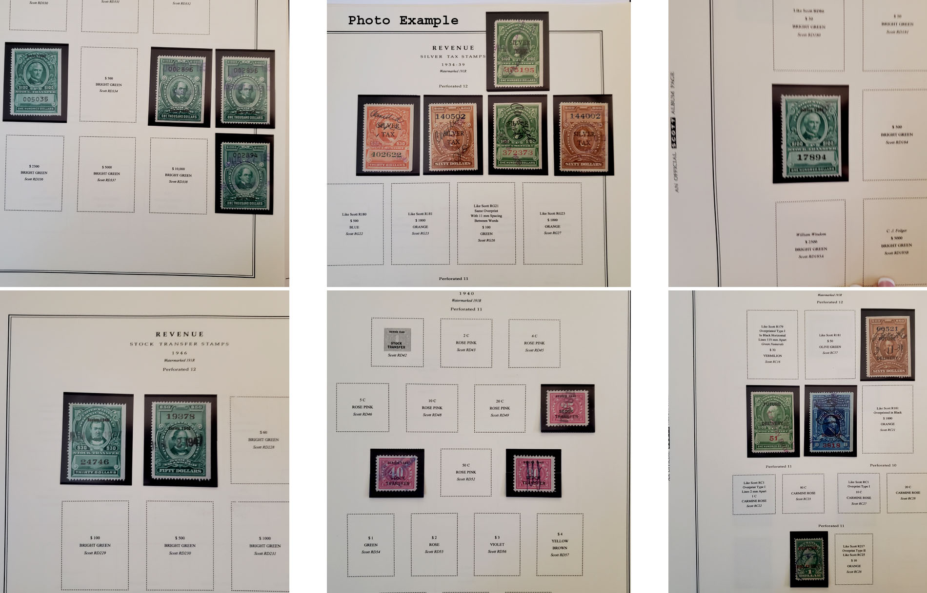 276 imageU.S. REVENUE COLLECTION, RB-RV, includes a few hundred mixed mint and used, hinged on album pages, most of the value here is in the Proprietary area with some Dated Greens and a few other areas, there are also some Taxpaids in the back of this group, values up to about $50 with some higher, there is some slight mixed condition, worth a look.