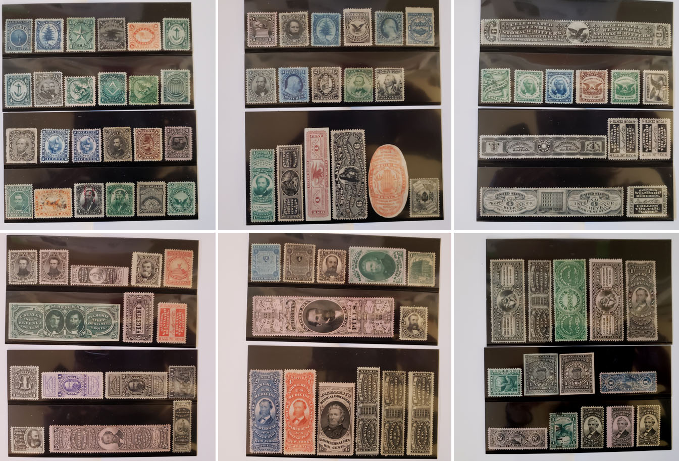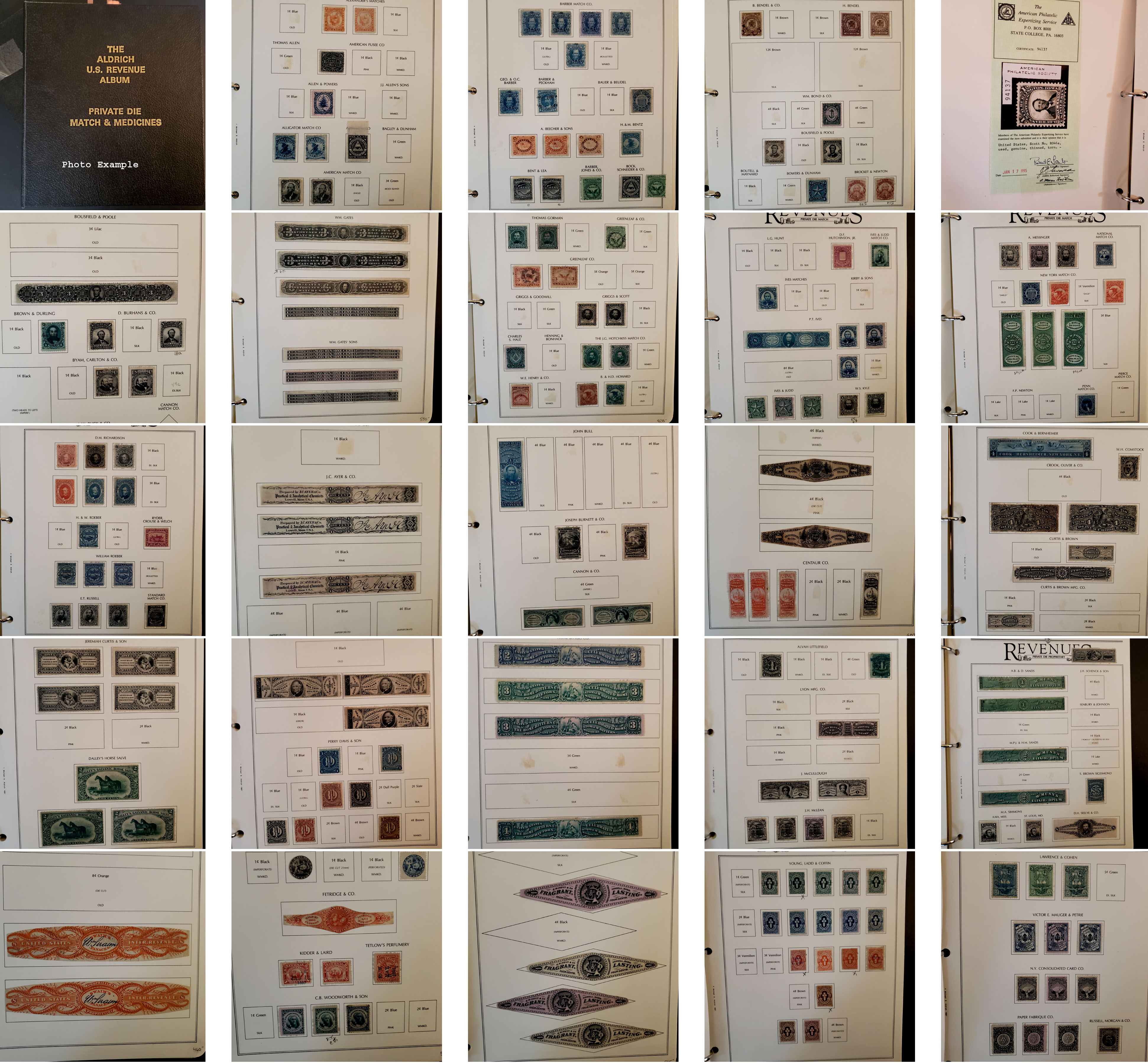 316 imageEXTENSIVE HIGH QUALITY MATCH & MEDICINE COLLECTION ON ALDRICH PAGES, includes several hundred virtually all different singles, hinged on Aldrich pages in a three ring binder, the overall quality of this collection is far above the norm for this area with many stamps being Very Fine or better, faults are to be expected but for the most part most are pretty minor considering this area, there are dozens and dozens of better stamps here: Match ($12,900) RO2b, 8d, 10a, 19a,b, 17e, 22u, 23e, 30b(2), 33c, 35a, 46a(2, one with APS cert.), 53a, 59b,e, 66a, 68b, 76a, 83b, 90a, 91b, 96b, 97a(rebacked), 100a, 111a, 118a, 119a, 120d, 131b, 137a,e, 138e(2), 154a, 156a, 163e, 164d, 178b, 182a, 186a; Medicine ($15,960) RS4f,g, 36d, 37a, 42a, 43a, 49c, 54b, 57d, 61d, 65e, 66a, 67d, 70b, 73a,b,d, 76a, 79b, 84a, 110b,d, 123b, 128d, 129b,c, 130d, 132c, 137d, 148c, 149c, 157c, 165b, 168c, 169b,d, 174c, 182b, 189c, 212c, 213c,d, 215b,d, 223b, 224d, 235b,d, 241c, 243b, 246a, 249d, 315; Perfume ($2,850) RT2h, 5a, 6d, 9d, 10c, 11b, 15b(D.T.), 15d, 21b, 22e, 25a, 26c, 28c, 29c; Playing Cards ($935) RU2a, 10a; given the quality of this collection the potential retail value probably exceeds the catalog value since there are many stamps which are worth 2-3 times or more of their catalog value on a retail or auction basis, without question one of the better quality M & M Collections we have ever offered, we have included many scans of the higher value pages but there are dozens of great looking stamp which are not included in the scans - which is way viewing this collection will not only be a pleasure but a huge advantage to the serious bidder.