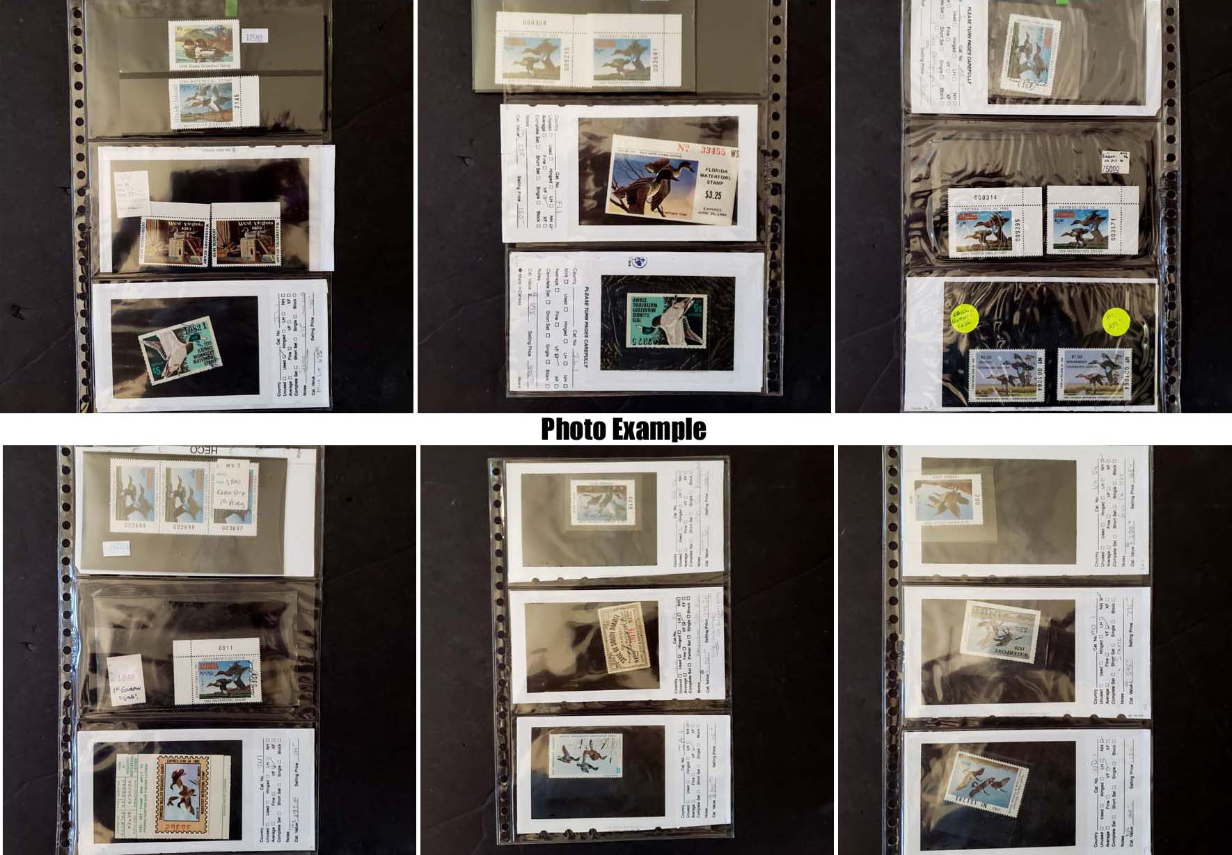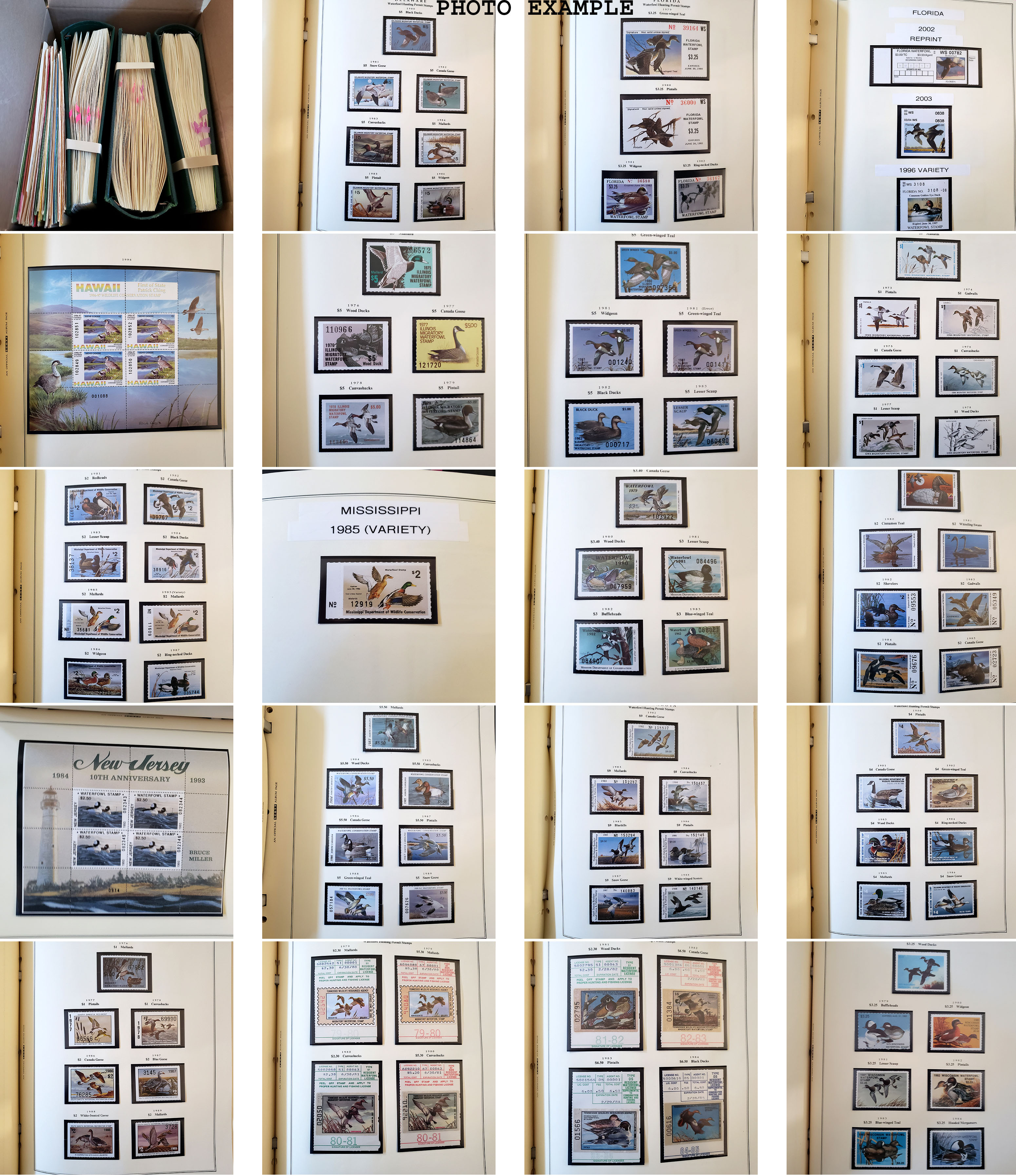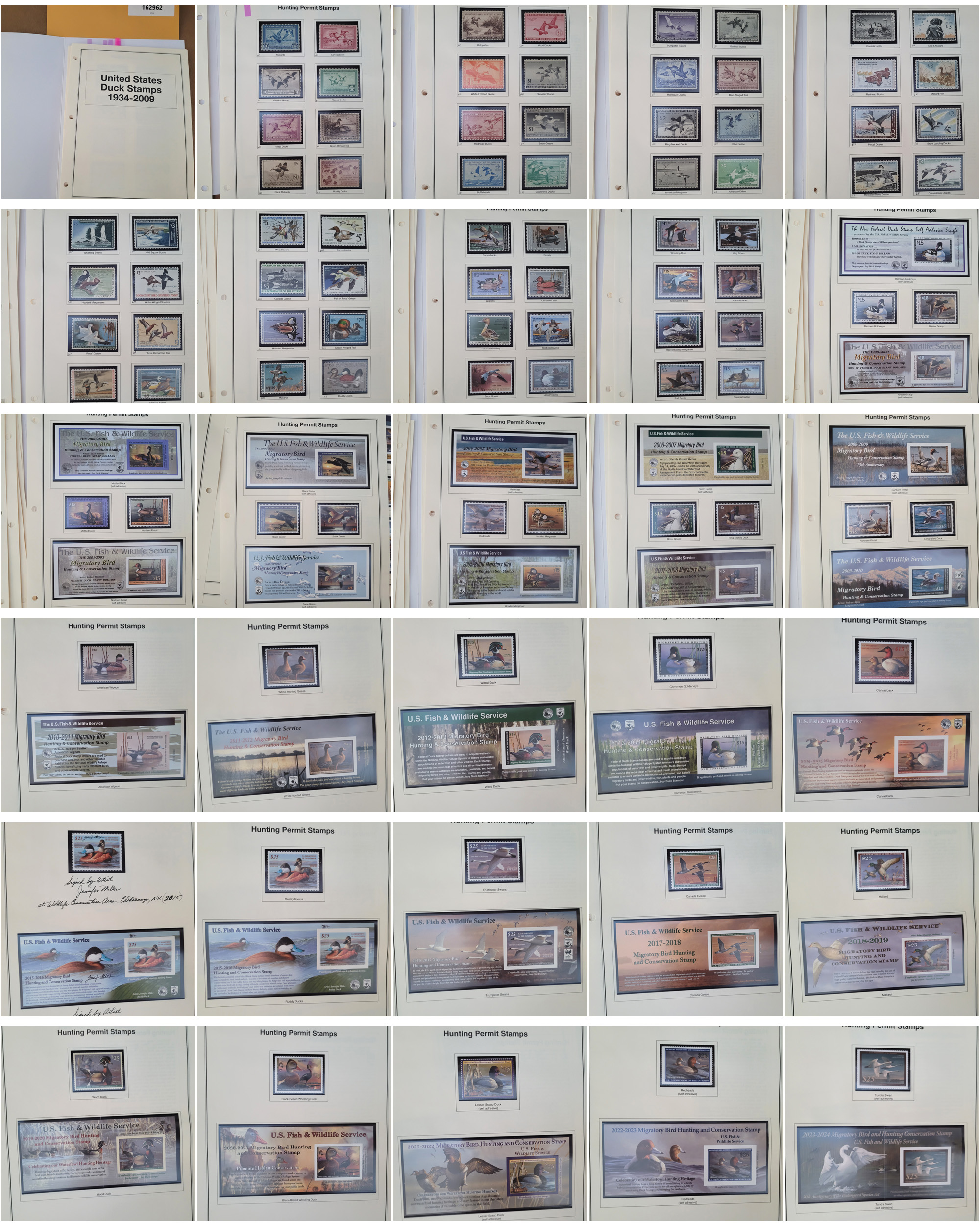 326 imageEXTENSIVE MINT STATE DUCK STAMP COLLECTION, includes several hundred singles, sets, blocks, panes and some S/S's, mounted on Scott album pages in three large National albums, virtually all different, the overall condition is extremely nice with most everything being NH and just maybe a few scattered faults, most of the States are here, each state listed in this description is complete for that state unless otherwise noted, we will list the state and catalog value for each along with any other important information for that state, AL ($472), AK ($463, includes Hunter 1987-2019 $375), AZ ($314, Jr. Ducks 2009-13 $400, includes Hunter 1987-2019 but missing 2016 $454), AR ($1,625 plus non-resident (2004-21), includes Hunter 1981-2019 $2,145 plus NR (2004-19)), CO ($385, includes Hunter w/tabs 1990-2000 $135), DE ($840, includes Hunter 1991-2019 $475), FL ($1,350, includes 1996 Variety), GA ($285), HI ($610, plus 1996 and 1997 mini sheets, 1996 imperf proof, includes Hunter 1996-2001 $81), ID ($350, plus 1991 Temp stamp, includes Hunter 1987-1995 $125), IL ($2,630, plus 1981 Error, plus with tabs 1985-1995 $290), IN ($580), IA ($1,540, includes Hunter 1990), KS ($190, includes Hunter 1987-1991 $155), KY ($385, plus with tabs, 1985-95 $235), LA ($1,490, includes all res./NR), MD ($895), MA ($640), MI ($1,000), MN ($820, plus with tabs, 1987-99), MS ($670, plus both 1985 varieties, includes Hunter S/A 1999-2020 except 2000, $895), MO ($943, includes Hunter 1979-1995 $1,270), MT ($300, includes Hunter 1987-2001 $380), NV ($670, plus with tabs, 1979-2017 $750, includes Hunter 1989-2017 $780), NH ($610, includes Hunter 1983-2007 $715), NM ($375, includes Hunter 1991-1994 $145), NJ ($973, plus 1993 S/S, includes Hunter 1984-2008 $810), NY ($225), NC ($765, includes Hunter 1997-2020 $700), ND ($690, includes Hunter 1988-2001 $300), OK ($570, includes Hunter 1984-1998 $180), PA ($380), RI ($620, includes Hunter 1989-2019 $630), SD ($344), TN ($1,700, plus the early issues on cards), UT ($325, includes Hunter 1990-1995 $155), VT ($400), VA ($1,650 includes all the S/A, serial # varieties and Hunter pairs), WV ($300), WI ($770, plus with tabs, $360), WY ($725), this collection is wonderfully complete but there is still room for expansion by adding the missing states and running some states up to date, a rare opportunity to obtain a very large "chunk" of material, buying a collection like this on a individual basis would cost well over $20,000 in the current market, we have included a number of scans of the early page for some states along with important varieties, don't let this one slip by.