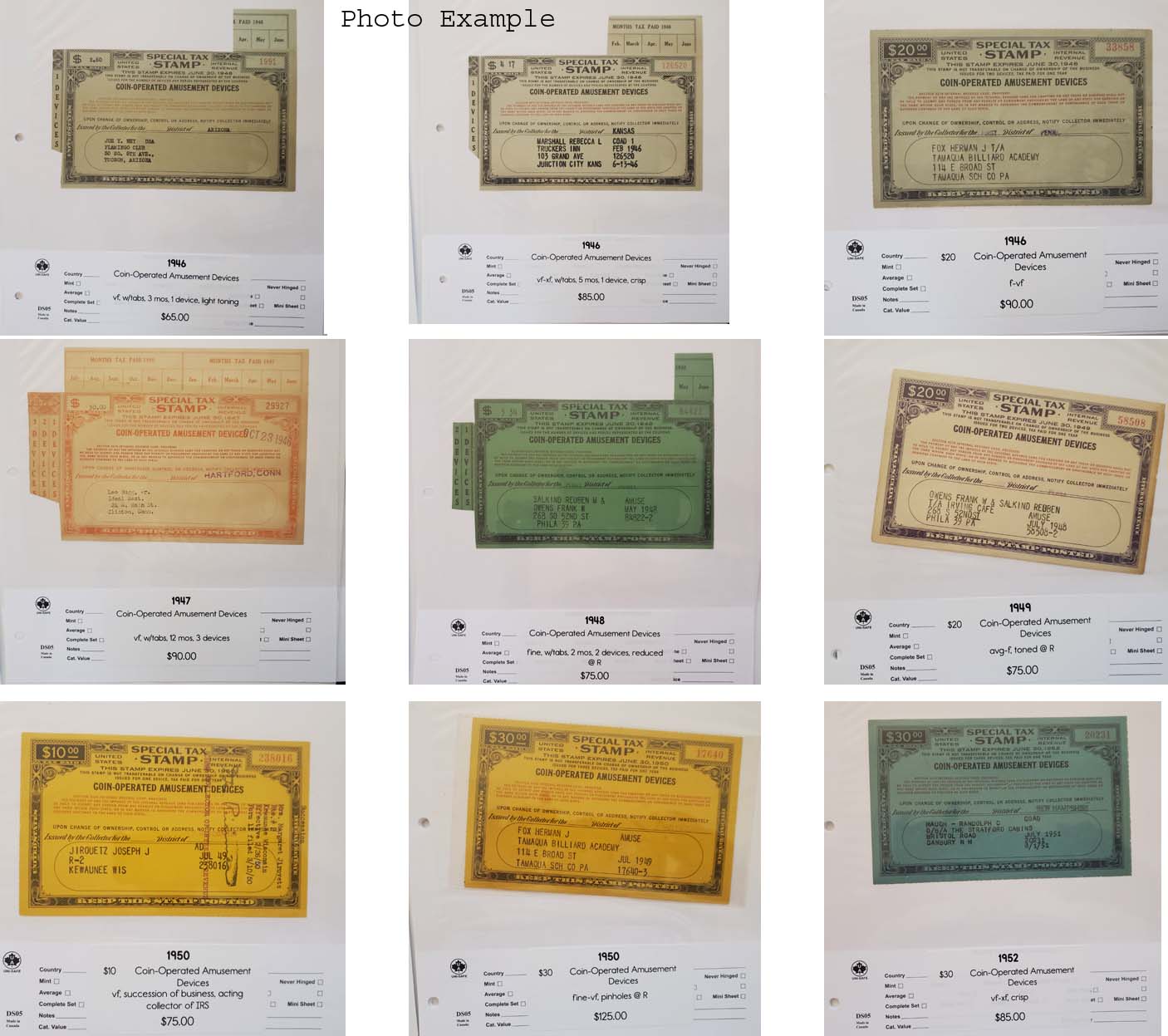 338 imageSPECIAL TAX - COIN-OPERATED AMUSEMENT DEVICES SELECTION, includes 29 various stamps with most being different by denominations or Tax Paid amount, all are used, some with stubs, the overall condition here is way above the norm for this area, only some scattered minor faults, contained on large retail pages, the total marked retail which we think is very much in line with the current market value is $1,720.00 with the range of values from $35-125 each, this material is from the Terence Hines collection, the better individual items will be offered in our Fall MEA Auction.