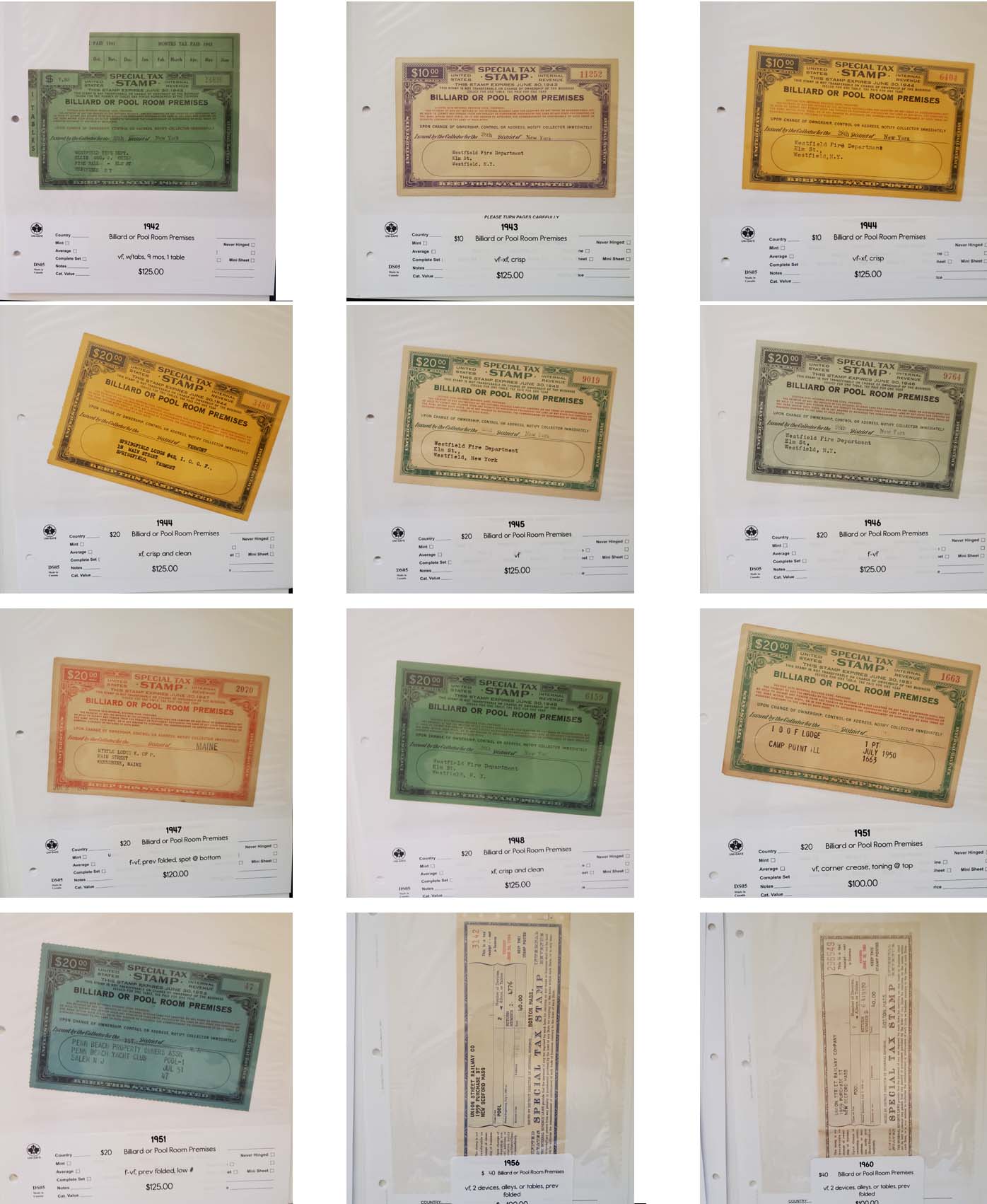 339 imageSPECIAL TAX - BILLIARD OR POOL ROOM PREMISES SELECTION, includes 12 various stamps with most being different by years and denominations or Tax Paid amount, all are used, one with stubs, the overall condition here is way above the norm for this area, only some scattered minor faults, contained on large retail pages, the total marked retail which we think is very much in line with the current market value is $1,420.00 with the range of values from $100-125 each, this material is from the Terence Hines collection, the better individual items will be offered in our Fall MEA Auction.