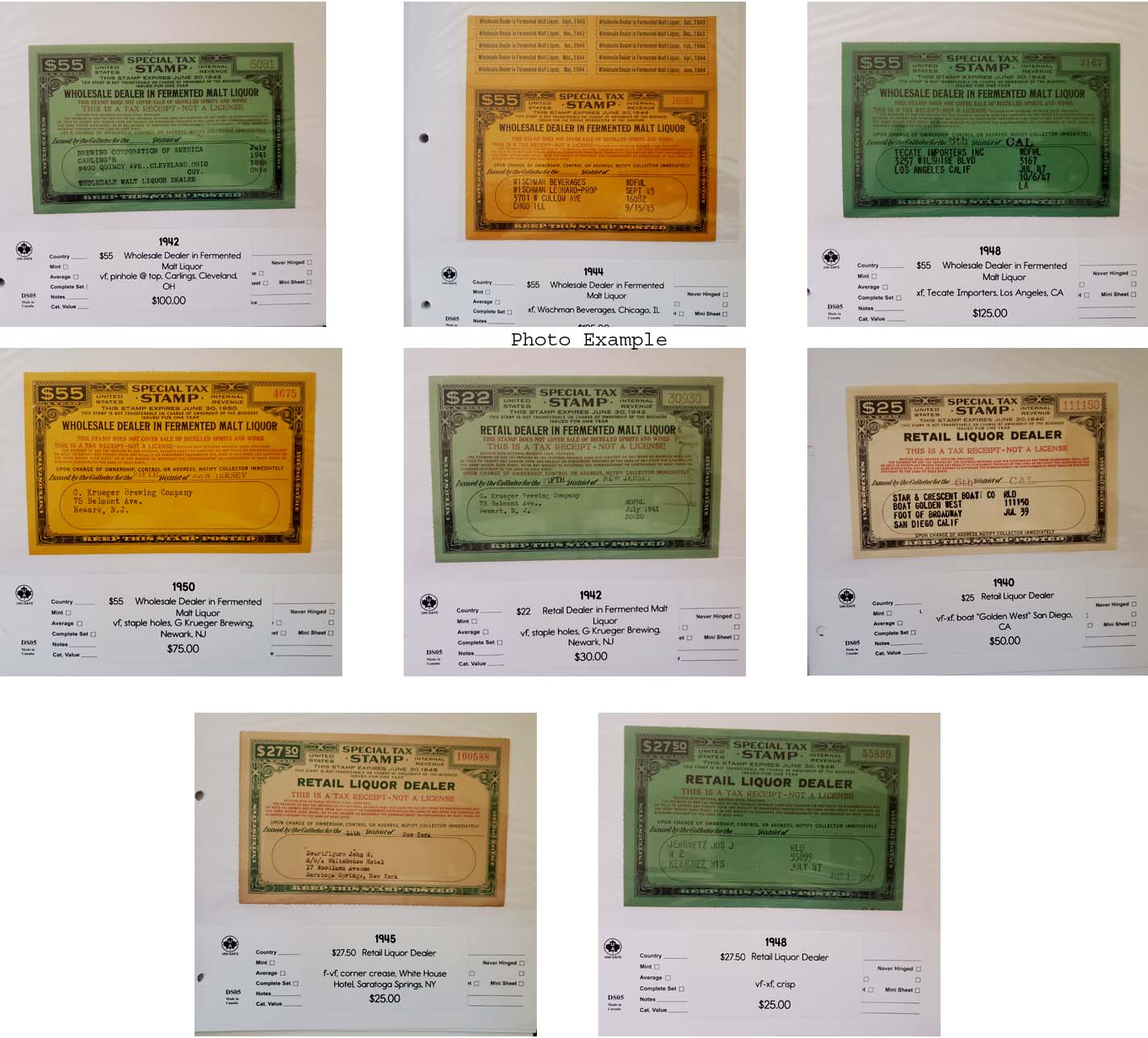 340 imageSPECIAL TAX - VARIOUS "LIQUOR" RELATED STAMPS SELECTION, includes 27 various stamps with most being different by years and denominations or Tax Paid amount, all are used, none with stubs, the overall condition here is way above the norm for this area, only some scattered minor faults, contained on large retail pages, the lot contains Wholesale Dealer in Fermented Malt Liquor(7), Retail Dealer in Fermented Liquors, Retail Dealer in Fermented Malt Liquor(8), Retail Liquor Dealer(11), the total marked retail which we think is very much in line with the current market value is $1,405.00 with the range of values from $20-125 each with most being in the $20-75 range, this material is from the Terence Hines collection, the better individual items will be offered in our Fall MEA Auction.