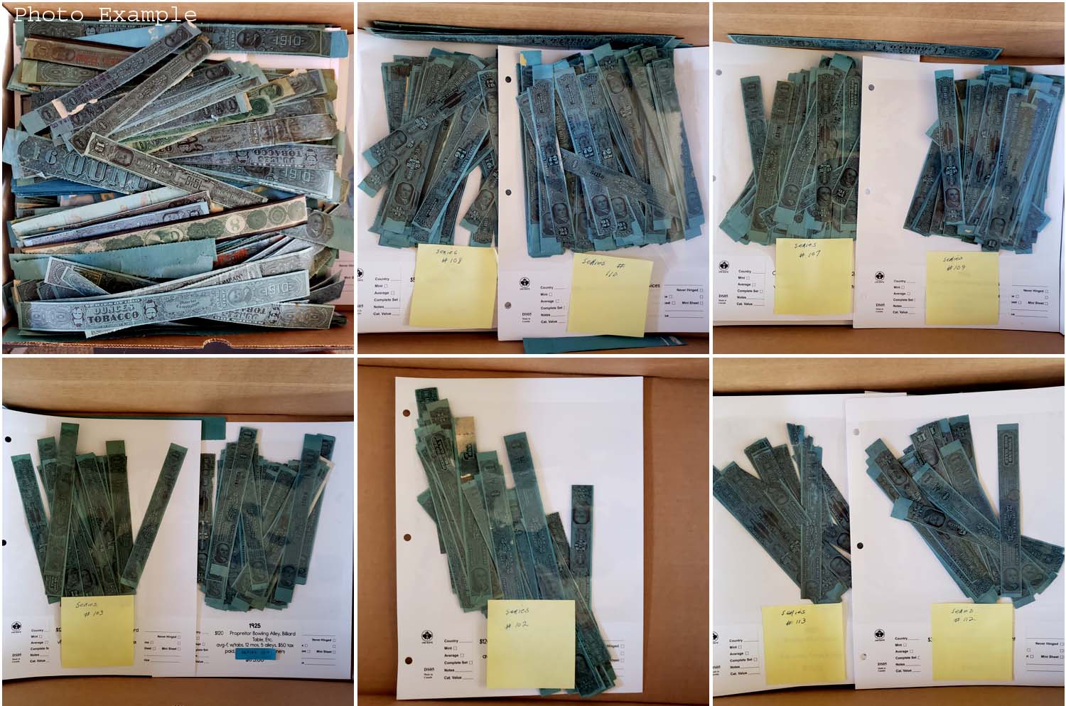 332 imageTOBACCO STRIP ACCUMULATION OF SEVERAL THOUSAND, includes several thousand various Tobacco strips, mostly loose but there is a good number which has been separated by Series Numbers too, contained in a large flat white box, there is duplication here - some heavy, usual overall mixed condition with faults to be expected but there are hundreds of very clean stamps too, there are some early issued but by far mostly strips are after 1900, there will be a significant amount of Springer catalog value here.