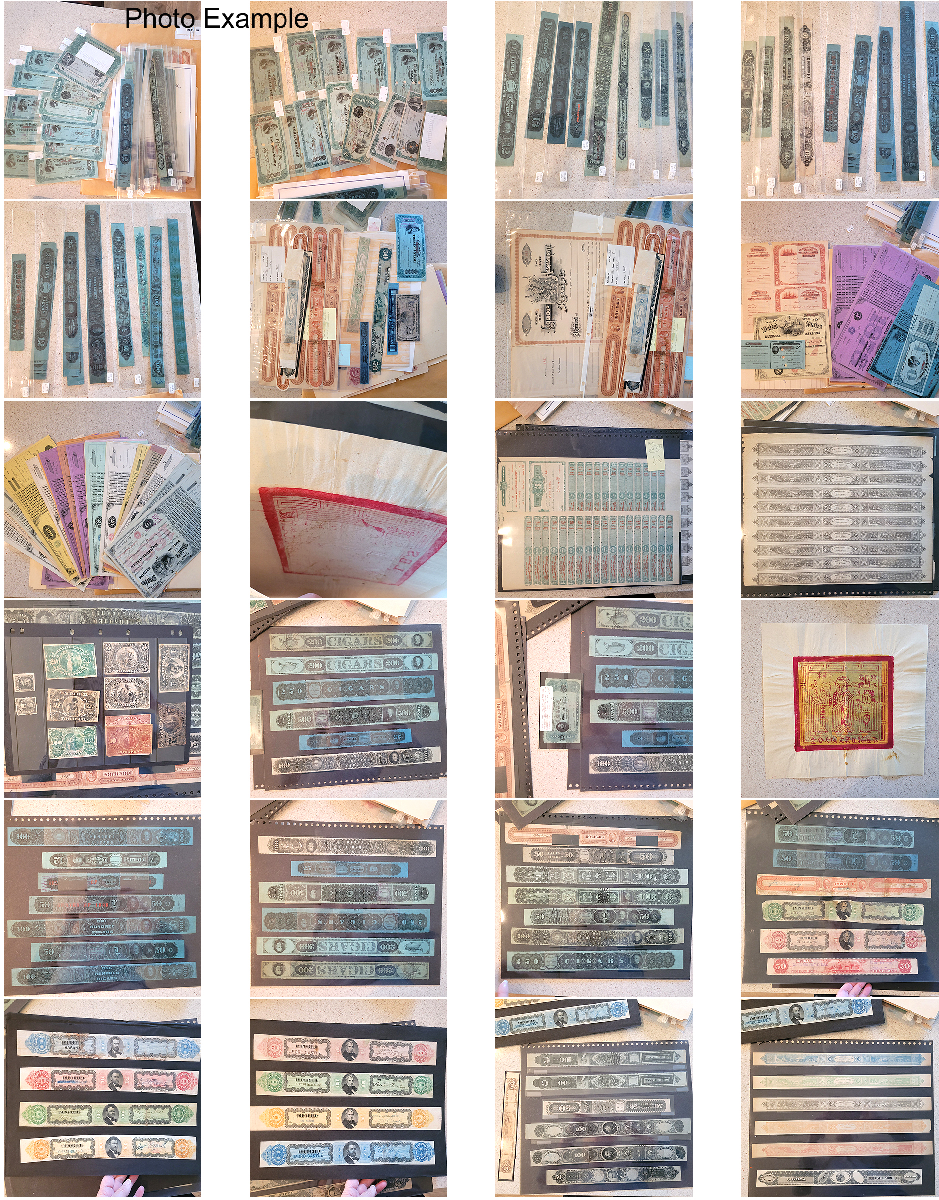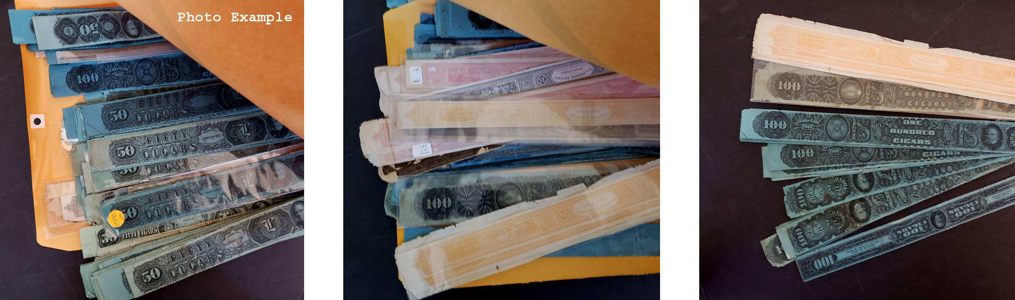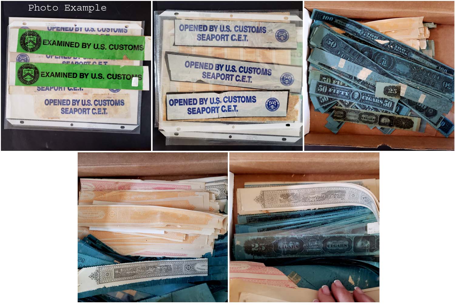 333 imageTOBACCO STRIP ACCUMULATION, includes several hundred various Tobacco, Cigar, Snuff, Cigarette and Custom Cigar strips, loose in a large flat box, some are in plastic holders but most are loose, there is some heavy duplication in the 50 and 100 Cigar strip area, there are some better early items here, the overall condition is very mixed with many faulty but some very clean strips too, we noticed a few provisionals scattered, there is probably a couple thousand dollars in Springer value here but most will be under $10 Springer, a nice lot to pick through.