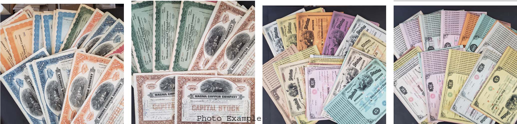 336 imageU.S. SPECIAL TAX STAMPS AND STOCK CERTIFICATE ACCUMULATION, includes several dozen various large Special Tax stamps, some with tabs and stubs - some without, good variety but there is duplication and they are in the usual condition which means most are punched remainders, there is also a group of a few dozen stock certificates - without stamps, there is duplication here too, contained in a large flat white box.