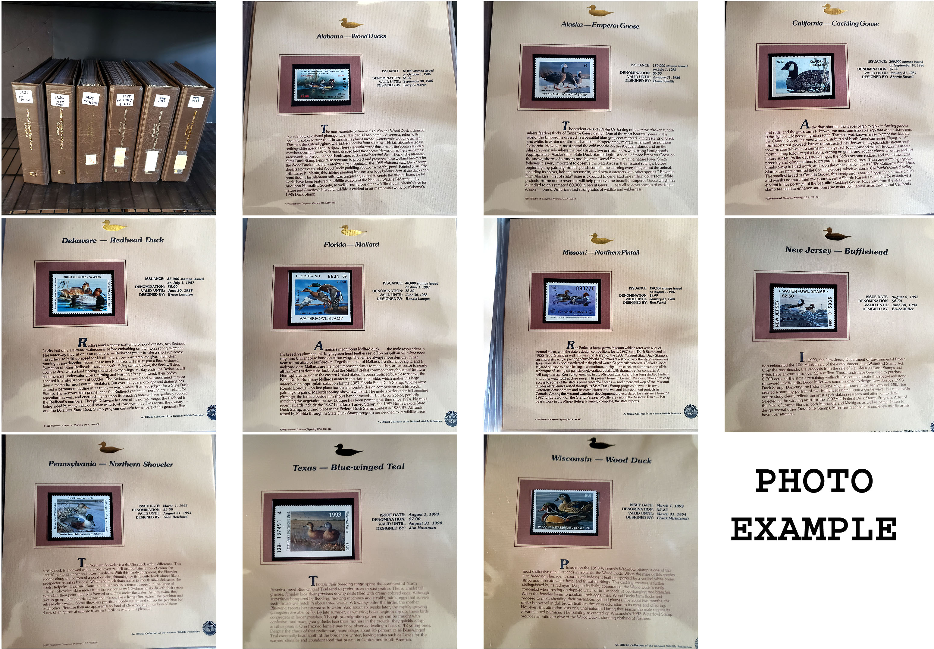 329 imageSTATE DUCK STAMP COLLECTION IS FLEETWOOD ALBUMS, includes a few hundred different mint singles from many various states, mounted in seven heavily illustrated Fleetwood albums but year dates, the collection runs from 1985-1993 and appears to be fairly complete for the period, very clean collection, the catalog value is our estimate and the total Face value is over $1,930.00, a very nice starter collection with room for expansion.