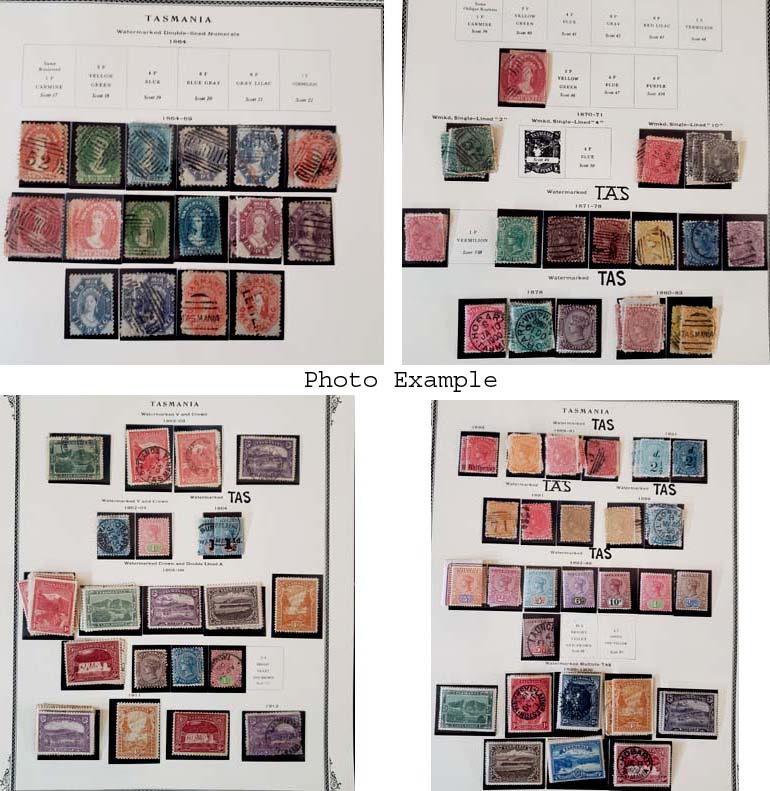 371 imageEXTENSIVE TASMANIA COLLECTION, includes several dozen mixed mint and used, mounted on about dozen Scott album pages, the collection covers most of the country including B.O.B. and some Revenues, the key to this collection is the number of specialty items which include shade varieties, perf varieties and a significant number of better cancels, there is duplication but also a huge number of different - again due to varieties, the overall condition is mixed and there are faults to be expected, there are many sound and Very Fine stamps here, values run up to about $100 with a few higher, we have included a number of scans but viewing this collection will be a huge advantage to the serious specialist and bidder in this area, most of the issues were figured on the lowest shade or perf variety so the actual catalog value should be much higher, a really wonderful collection and well worth a good look.
