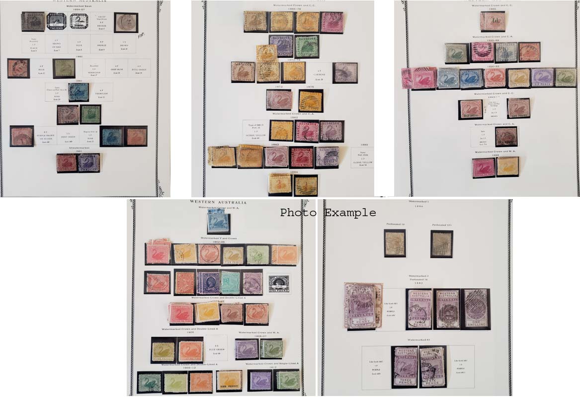 373 imageEXTENSIVE WESTERN AUSTRALIA COLLECTION, includes several dozen mixed mint and used, mounted on about dozen Scott album pages, the collection covers most of the country including B.O.B. and some Revenues, the key to this collection is the number of specialty items which include shade varieties, perf varieties and a significant number of better cancels, there is duplication but also a huge number of different - again due to varieties, the overall condition is mixed and there are faults to be expected, there are many sound and Very Fine stamps here, values run up to about $100 with a few higher, we have included a number of scans but viewing this collection will be a huge advantage to the serious specialist and bidder in this area, most of the issues were figured on the lowest shade or perf variety so the actual catalog value should be much higher, a really wonderful collection and well worth a good look.