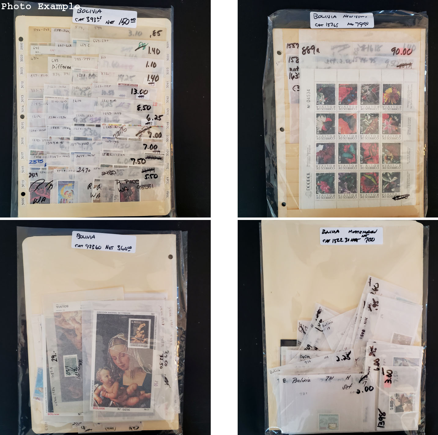 388 imageBOLIVIA MINT NEW ISSUES , includes several dozen mint singles, sets, booklets and a large number of S/S's, mostly contained in glassines where each is identified by Scott number and the current catalog value, runs from #544//1615 and includes some B.O.B., virtually all different, this group is as received from the new issue dealers, nice clean lot .