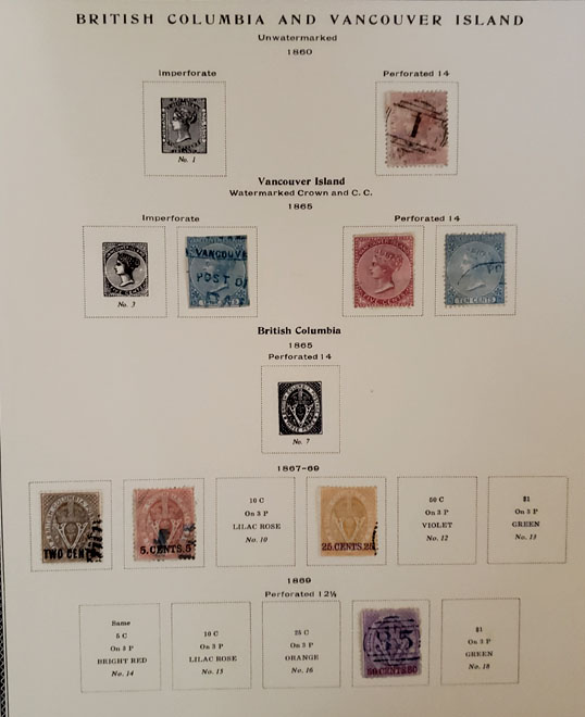 393 imageCLASSIC BRIT. COLUMBIA & VANCOUVER ISLAND USED COLLECTION, includes eight different used singles, hinged on a Scott album page, the overall condition is very clean with only some minor faults scattered, generally with light cancels and many with great color, the lot includes 2, 4, 5, 6, 8, 9, 11, 17, a very nice collection in much better than the norm condition, a great breakdown retail lot.