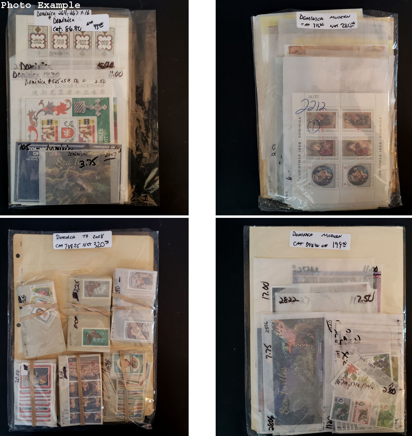 448 imageDOMINICA MINT NEW ISSUES , includes several dozen mint singles, sets, booklets and a large number of S/S's, mostly contained in glassines where each is identified by Scott number and the current catalog value, runs from #268//2373, virtually all different, this group is as received from the new issue dealers, nice clean lot.