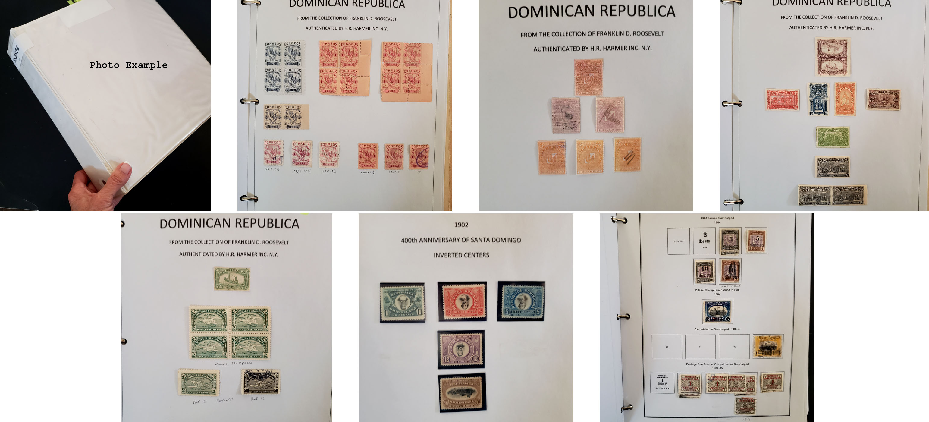 449 imageDOMINICAN REPUBLIC COLLECTION, includes several hundred mixed mint and used, hinged on album pages in a three ring binder, runs to about 1980 and includes a very nice B.O.B. section with Semi's and Airmails, overall fairly clean with some scattered faults, there are a significant number of varieties here especially in the Imperf issues, we also saw a page of Inverts from the 1902 Issue, there are several pages included which are from the F.D.R. stamp collection, a very nice showing from this country and plenty of room for expansion, the catalog value listed is our estimate and it is likely low, well worth a good look.
