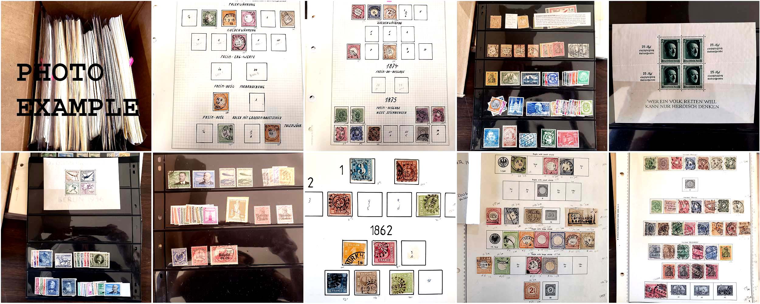 477 imageGERMANY AREA COLLECTIONS GROUP, includes 29 various Germany Area collections on album pages contained in clear plastic holders and in a medium box, these collections generally contain mint and used and some multiples, many collections are all different, the overall condition of this group is mixed and faults are to be expected, most have a total catalog value and they range from about $500 to $4,700 each, the catalog value years can range over many different years so the current catalog value is certainly more than the total listed here, this group includes Germany(12), Berlin(2), Saar, DDR(2), Occupations(6), Danzig, Bavaria, various States(4), there is one collection which catalogs $4,700, most of these collections are ready to go for the retail dealer or internet sales.