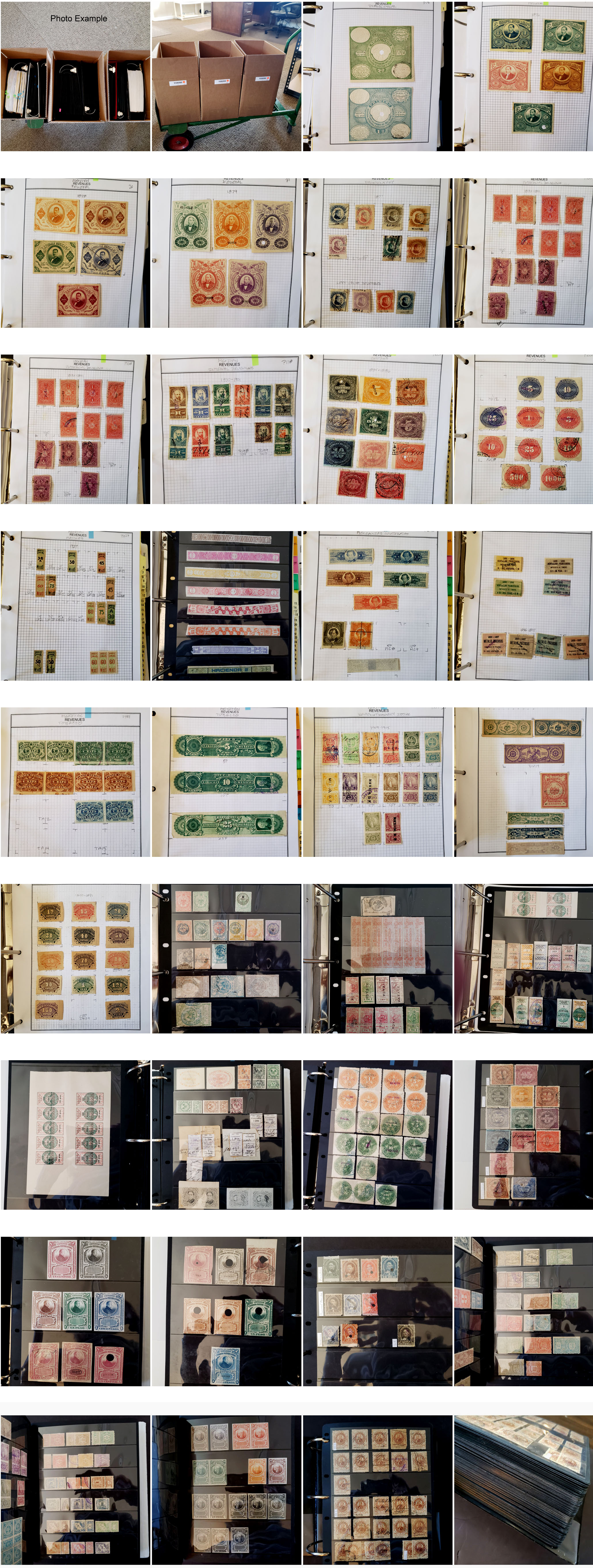 599 imageEXTENSIVE MEXICO REVENUE COLLECTION, includes tens of thousands of mint and used revenues, the collection is contained in one very large three ring binder, this album is all different and pretty much covers many of the areas in the Mexico Revenue Catalog from front to back, then there are six other large to very large three ring binders with dozens of black stock pages, this section contains many duplicates from the collection but there are also hundreds of stamps in these binders which are NOT present in the main album, also many of the lower value issues have 20-30 or even more duplicates but many of these have different State overprints, it appears the collector was trying to get an example of ever state on every issue which of course would be a daunting task, the overall condition of the collection and stock is mixed but generally pretty clean but there are faults to be expected here, some of the highlight sections are: "CF"-$2,515, "DO"-$4,141, "R"-$4,550, "AD"-$503, "HT"-1,738, "MP"-$502, "PE"-$767, "RV"-$757, "DU"-$1,525, "M"-$840, "PI"-$1,320, "SO"-$500, "YU"-$585, the collection and better item in the stock catalog about $25,000, we estimate there is easily another $10,000 in lower value(under $3) catalog value, also there are a few dozen proofs which are not figured in the catalog value and there are many unlisted varieties which also are not figured, then there is certainly thousands of dollars value in many of the better states overprints on common stamps, in addition there is a printed Mexico Revenue Catalog included with this lot, it is in a very large three ring binder and most of the stamps in the collection are noted in the catalog along with the better duplicates which are in the stock books, this is a most amazing collection and without question the most extensive Mexico Revenue collection we have ever offered in over 50 years of selling retail and at auction, to duplicate what this collector has done would easily cost $30-40 thousand dollars and decades of hunting and searching and buying, this group is housed in three medium boxes to cutdown on weight, we have included dozens of scans of just some of the better pages in the collection and stock but there are hundreds of better stamps which are not in these images, viewing this collection in person will be a huge advantage to the serious bidder, this collection is being offered intact as received from the estate of the collector, nothing has been removed, a once-in-a-lifetime opportunity to jump into this very popular area of philately.