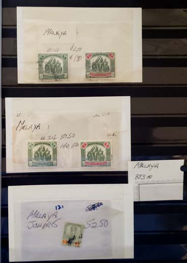 595 imageMALAYA USED GROUP, includes a couple dozen different used singles, contained on a black stock page, values up to about $100 with a couple higher, expect a few scattered faults.