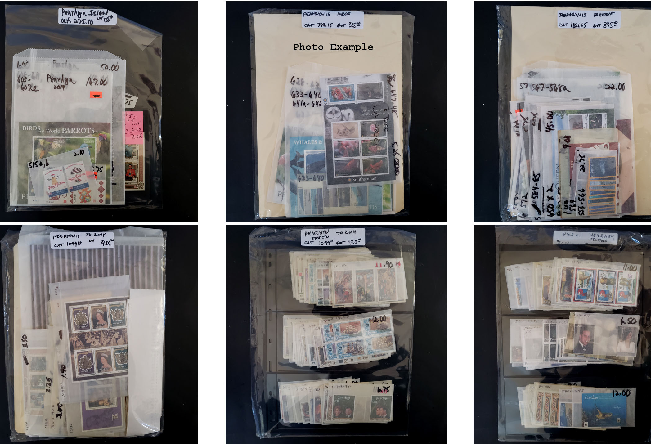624 imagePENRHYN ISLAND MINT NEW ISSUES , includes several dozen mint singles, sets, booklets and a large number of S/S's, mostly contained in glassines where each is identified by Scott number and the current catalog value, runs from #114//641, virtually all different, this group is as received from the new issue dealers, nice clean lot.
