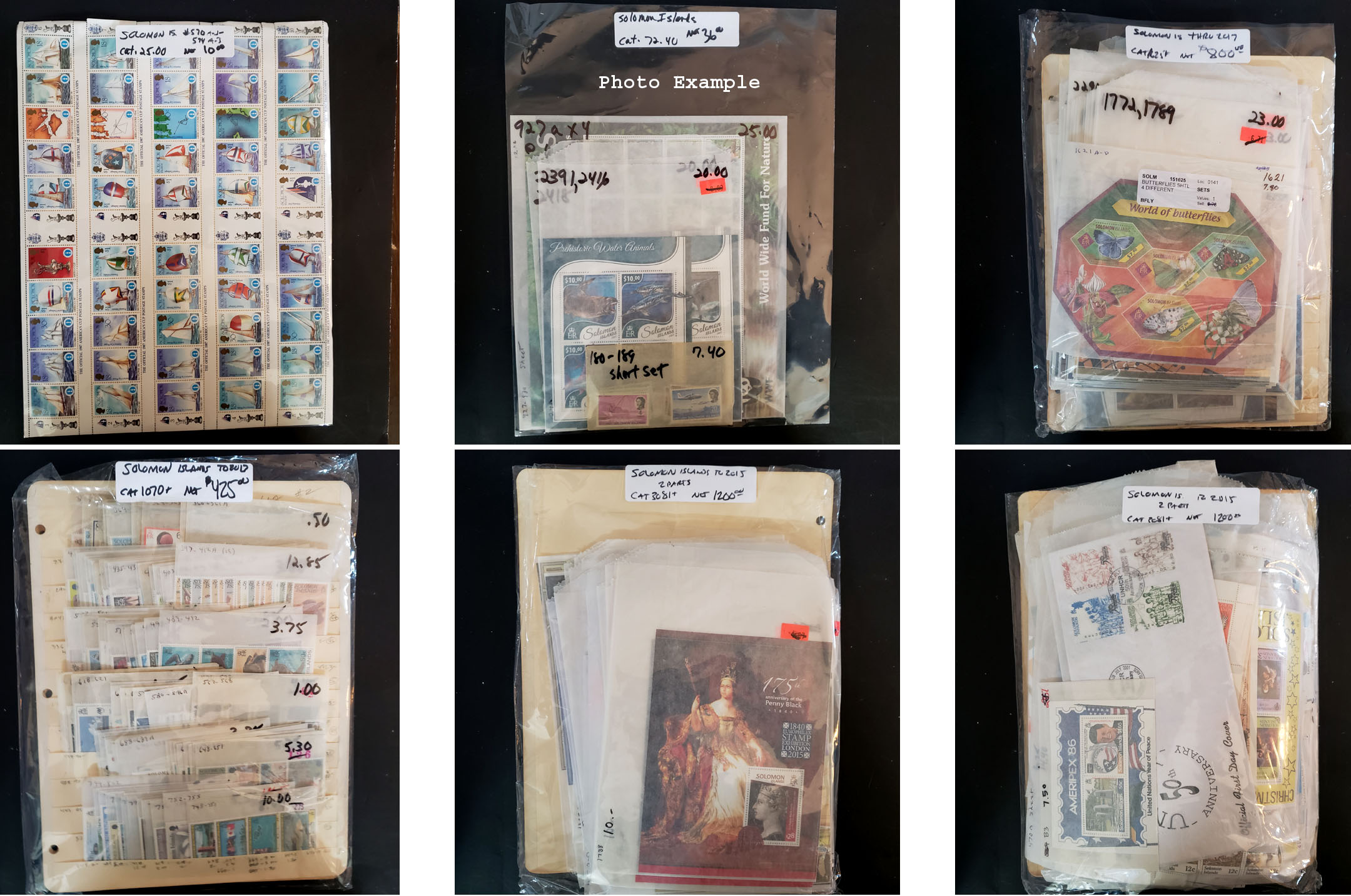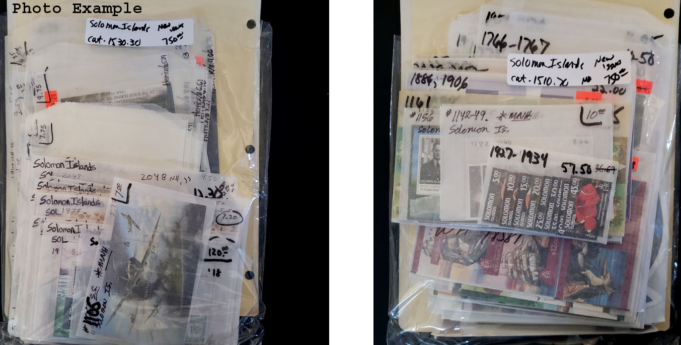 649 imageSOLOMON ISLANDS NEW ISSUES , includes several dozen mint singles, sets, booklets and a large number of S/S's, mostly contained in glassines where each is identified by Scott number and the current catalog value, virtually all different, this group is as received from the new issue dealers, nice clean lot.
