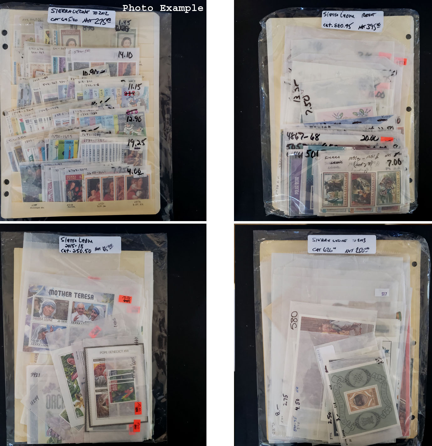 645 imageSIERRA LEONE MINT NEW ISSUES , includes several dozen mint singles, sets, booklets and a large number of S/S's, mostly contained in glassines where each is identified by Scott number and the current catalog value, runs from #440//5067, virtually all different, this group is as received from the new issue dealers, nice clean lot.