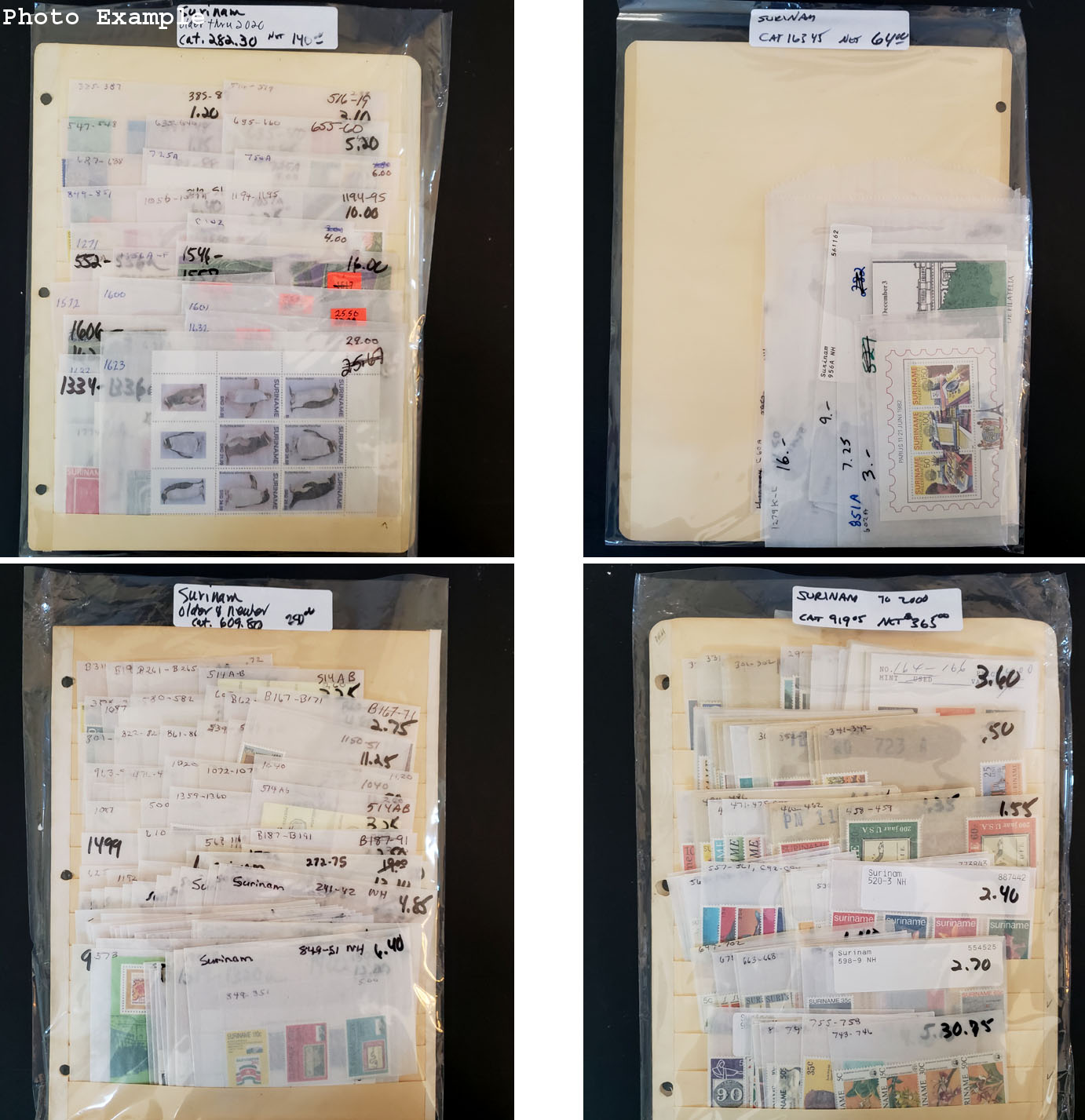 656 imageSURINAM MINT NEW ISSUES , includes several dozen mint singles, sets, booklets and a large number of S/S's, mostly contained in glassines where each is identified by Scott number and the current catalog value, runs from #164//1623, virtually all different, this group is as received from the new issue dealers, nice clean lot .