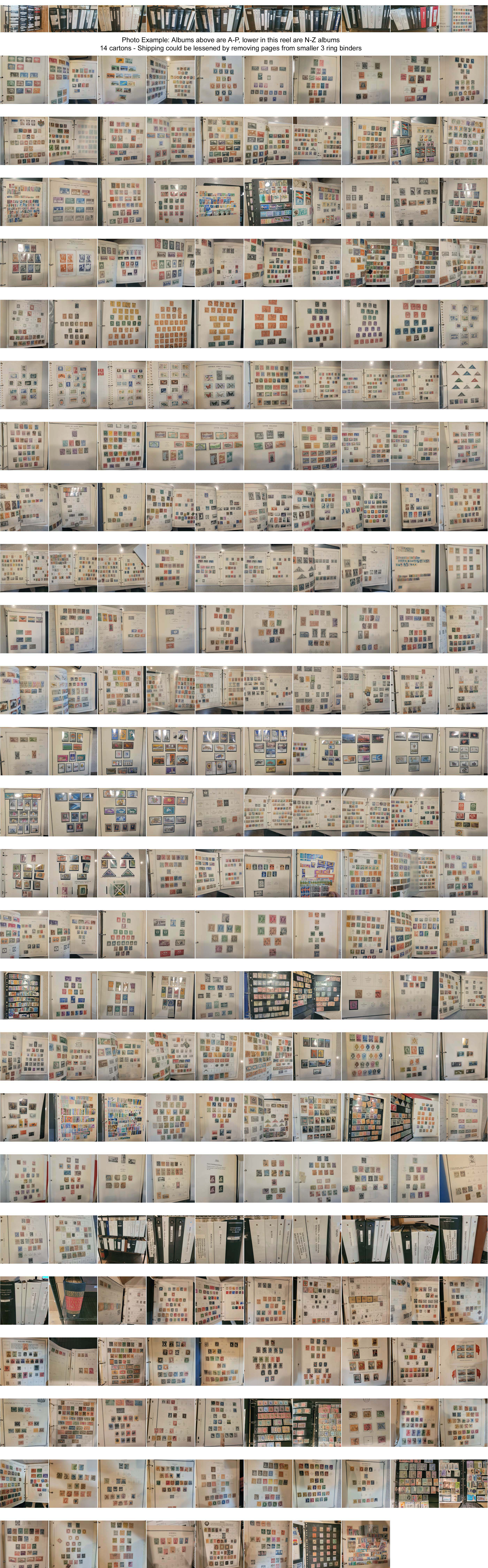 700 imageEXTENSIVE WORLDWIDE COLLECTION IN 128 ALBUMS, includes tens of thousands of mixed mint and used singles, sets and S/S's, housed in 128 albums and three ring binders(1,2,3, and 4 inch binders), included are 21 large blue international post binders, virtually all are Scott album pages, there appears to be over 200 different countries here and includes a good showing of many of the major countries with 1-3 albums for most, the collection is mixed mint and used but we estimate that there is about 80% used here, many of the countries have 1-3 partial sets of pages over various years so duplication is here especially in the early issues, there is a wide range of dates across most of this collection but there appears to be only a small amount of material post 1980 for most of the counties, the overall condition is mixed and faults are to be expected but there is a good number of stamps which are sound and Very Fine too, also some of the mint stamps are in mounts instead of hinging, in addition there are five albums of misc. Worldwide at the end of this collection, some of the more valuable countries include: Austria (4 albums), Bulgaria (2), Canada (2), Germany (2), Greece (3), Hungary (3), Ireland (2), Netherlands (4), Portugal & Col. (2), Russia (3), Spain & Col. (2), Sweden (2), Switzerland (2), there are many singles, sets and S/S's with values in the $50-100 range and some higher, as for the overall evaluation of this collection - here is how we figured it: 10 albums valued at $1,000 or more, 20 at $500+, 20 at $300+, 20 at $200+, 40 at $100+ and 18 at $50+, there may be a few which are worth less than $50 but we feel our estimates are conservative since there are many albums which catalog thousands of dollars each and in fact we would not be surprised that the total catalog value here easily exceeds $300,000, so factoring out our estimates would make the total estimated value in the $35,000-40,000 range, a bid at half this would be a tremendous bargain, one must figure in that shipping will cost several hundred dollars unless it is picked up at our office(which would certainly be preferred), there is an incredible opportunity here to break this massive lot down for retail singles and sets or even into individual country lots especially with the duplication in some countries, since most are in three ring binders this breakout should really quite easy to work with, we have included a few scans of this huge collection but viewing will be a tremendous advantage for the serious bidder, certainly one of the better Worldwide collection lots we have offered in quite some time and this one is well worth a good look and serious consideration.