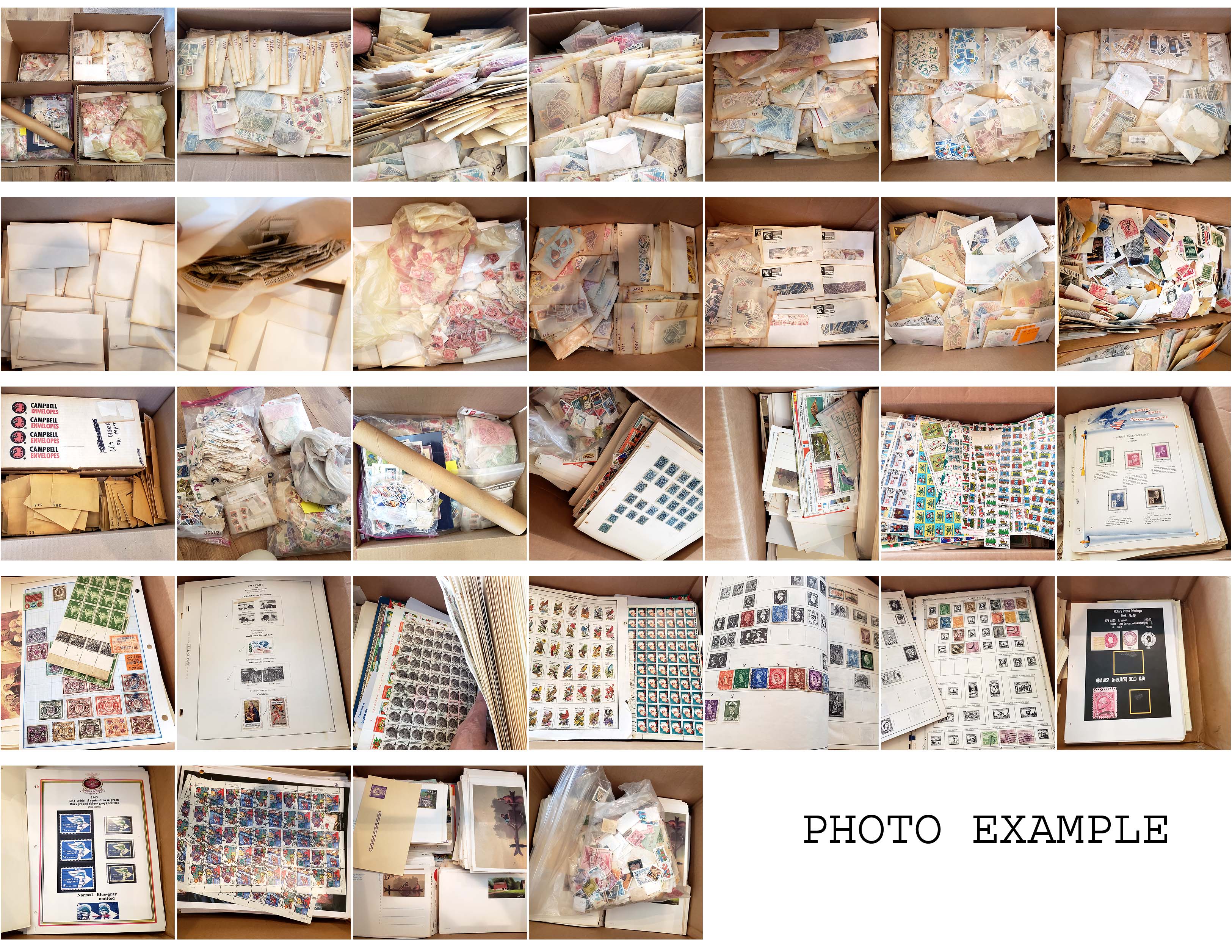 124 imageU.S. USED ACCUMULATION OF 100,000's , jammed packed into four cartons, mostly used stamps but there are some covers and postcards and also a few scattered mint items including a tube of Press Sheets, there is duplication here and some heavy in spots, the condition is mixed and there are faults, there is also a good amount of catalog value in some areas, plan on many, many hours of hunting and searching through this one.