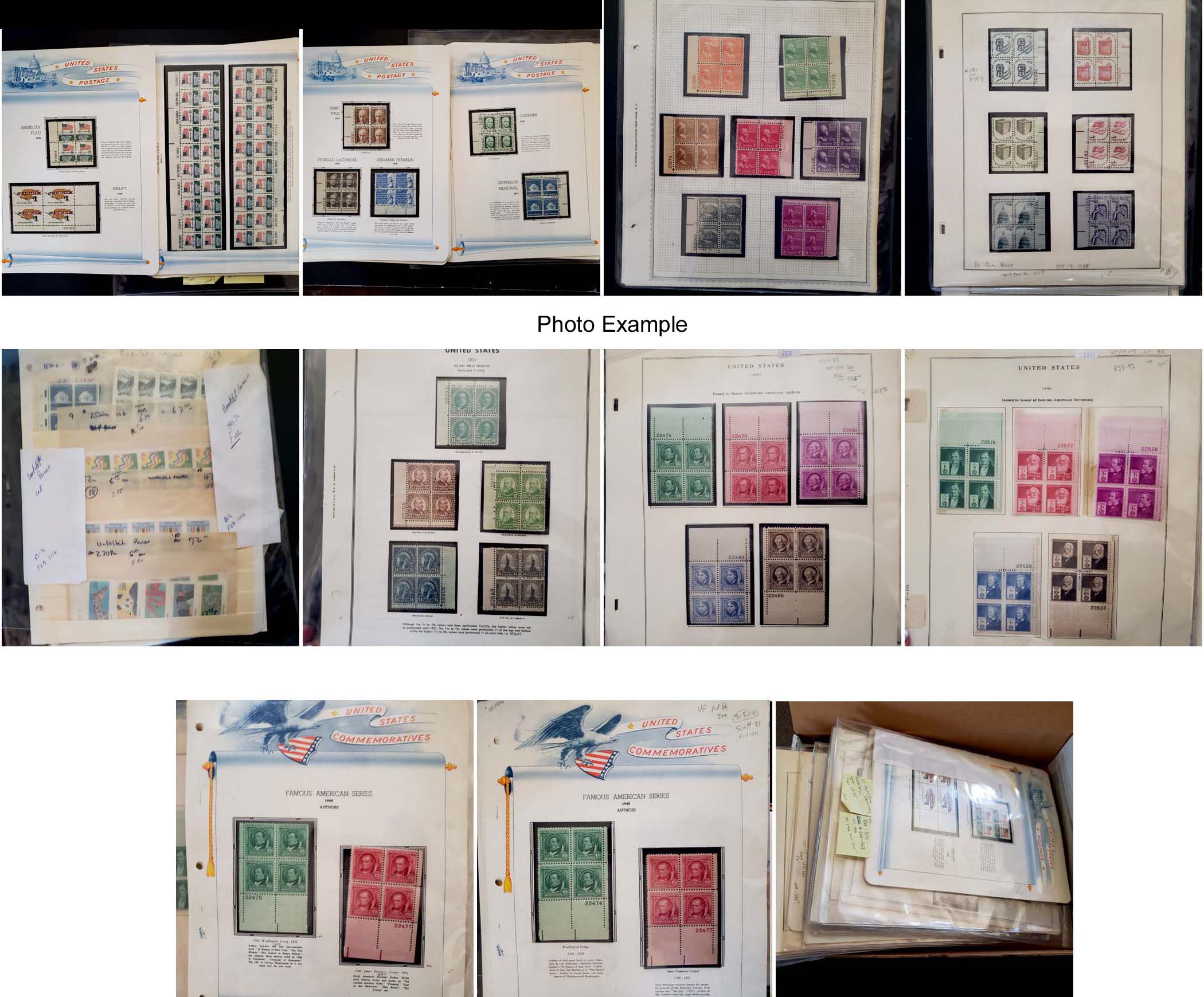 165 imageU.S. PLATE BLOCK COLLECTIONS GROUP, includes 15 various U.S. Plate Block collections on album pages contained in clear plastic holders and in a large flat white box, these collections generally contain mint and used and some multiples, many collections are all different, the overall condition of this group is mixed and faults are to be expected, there is some duplication and also some face value material too, most have a total catalog value and they range from about $200 to $1,250 each, the catalog value years can range over many different years so the current catalog value is certainly more than the total listed here, there is on collection of Booklet Panes, and one with coil strips and PNC's, the catalog value listed is for those collections which have been cataloged, most of these collections are ready to go for the retail dealer or internet sales.