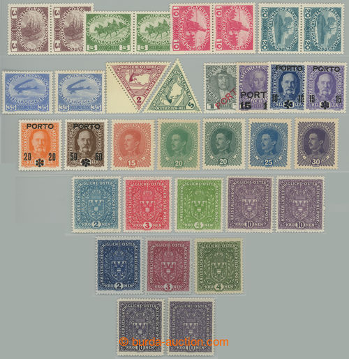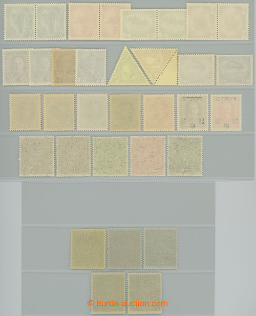 Philately. SELECTION of / Mi.180-184 - War 2x (2 shades 35H), 221-224, Charles incl. 20H light, 200-203, 2K-10K dark thin, 10K clear also unclear print, ditto on granite paper 208 II-211 II and in addition rare 211 I - 10K close