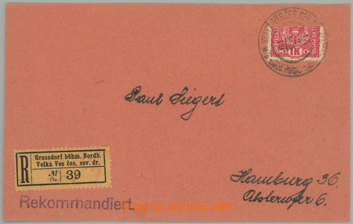 Philately. PŮLENE FRANKATURY / Reg letter to Germany, franked with. bisected stmp Coat of arms 1 Kr, CDS VELKA VES CES. SEV. CDS. 15/2 19, on reverse arrival HAMBURG18.2.19; good condition (Image) (Image2)
