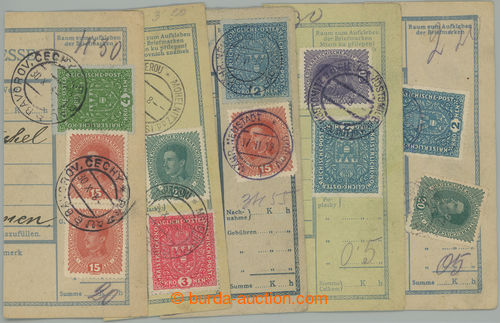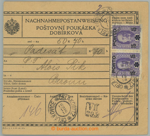 Philately. POSTAGE-DUE VE FUNKCI POSTAGE STAMPS / larger part Austrian post. C.O.D. order with provisional franking Austrian postage-due stamp. as Pr to exhaustion-issue 15/36h violet, Mi.P61, CDS CELAKOVICE 16/12 18, on reverse