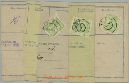 Philately. perforation hole PLATNOSTI / comp. 2 pcs of parcel dispatch card segments with mixed frankings with Austrian stamp., 1x stamp. Charles 15h + Hradcany 10h with CDS DUCHCOV 11.III.19 and 1x cut with Coat of arms 40h +