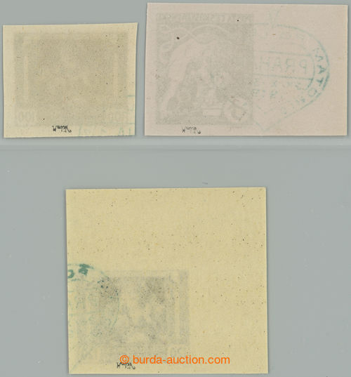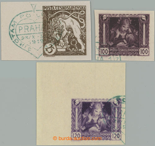 Philately. Pof.28Nq, 31Nq, 32Nq, imperforated stamp. Lion Breaking its Chains 25h brown with L margin with whole green additional-printing + Mother and Child 100h brownlila with ctvrtinou green added-print and 120h violet, UL
