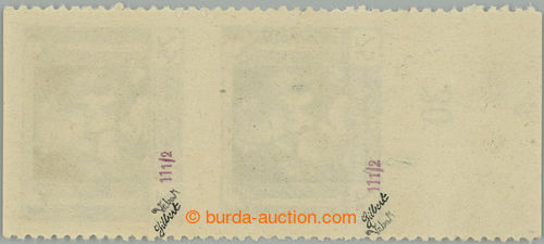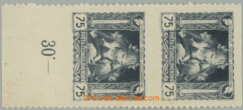 Philately. Pof.30 production flaw, Mother and Child 75h grey, the bottom marginal vertical pair with control-numbers and with omitted horiz. perf, vert. perf line perforation 11½; mint never hinged, exp. by Gilbert and Vrba (Image) (Image2)