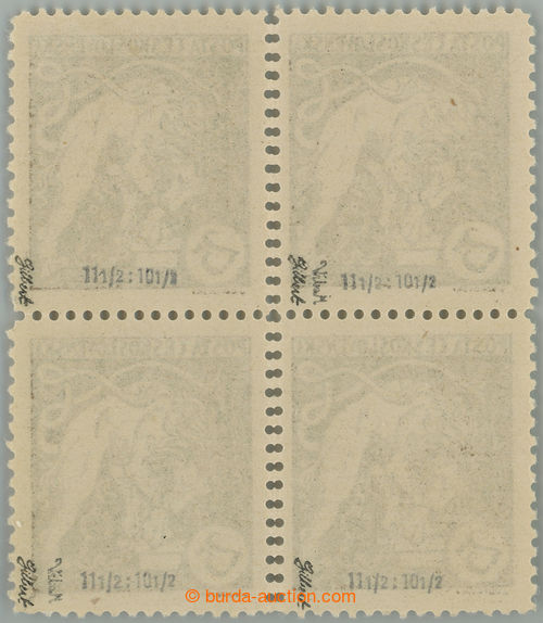 Philately. Pof.30Nq, Mother and Child 75h grey, L marginal imperforated blk-of-4 with zelenymi added-print through/over quarters, resp. middle stamp.; mint never hinged, exp. Vrba (Image) (Image2)