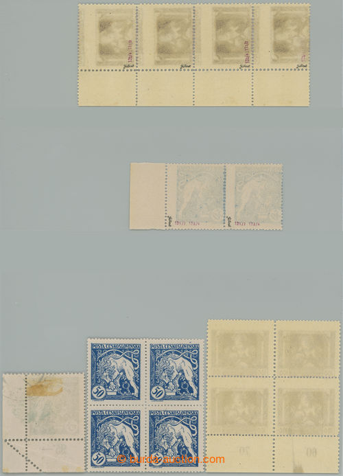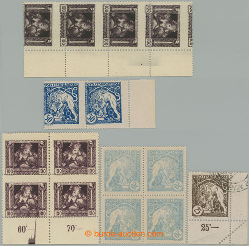 Philately. VYROBNI VADY / Pof.28, 29, 31, comp. of 5 production flaw on/for values 25h, 50h and 100h, contains i.a. block of four Pof.29A with offset on gum, 2x shifted perforation to to picture of stmp., perf fold in corner etc..;