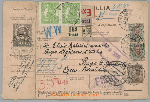 20h blue-green + 2x 5h blue-green + Pigeon-issue 6x 5h blue + on face-side pair 10h green, cancelled by postmark PRAGUE CLO/ 5.X.20, supplemented with by hand writen notice 3K30 placen and stripped/pull-down 1 Italian stamp., delivering fee paid