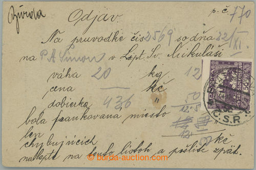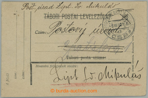 Philately. RETURN REPORT / provisional return advertisement on/for uherskem card field post sent with CDS LIPTOVSKY SVATY MIKULAS 6.XII.20 to post off. to Bratislava where vylepili chybejicich 50h stamp. Hradcany 50h violet with