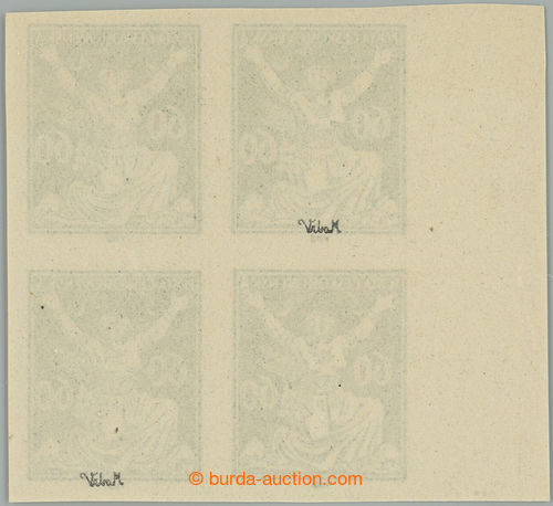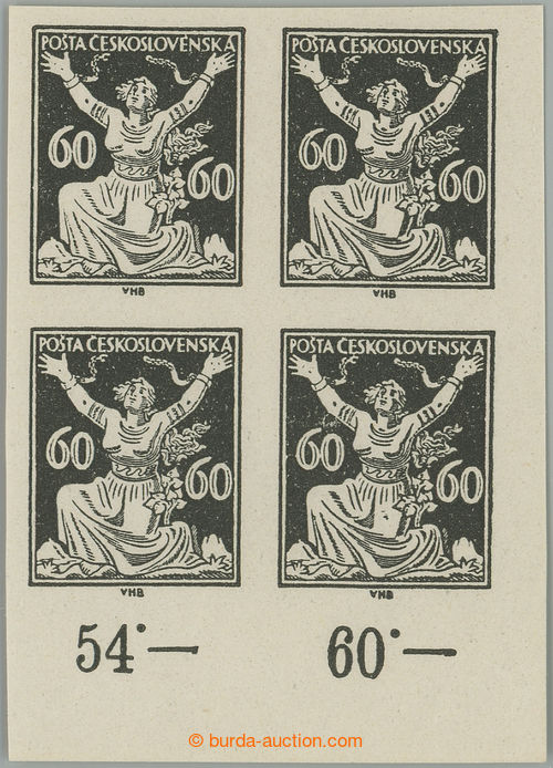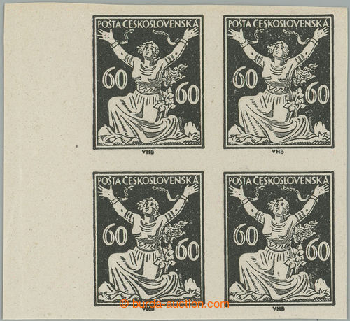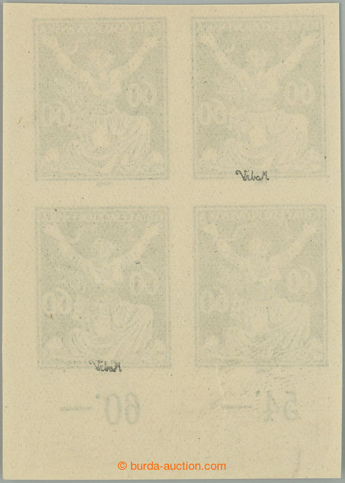 Philately. PLATE PROOF values 60h in black color, LR corner blk-of-4 with control-numbers, C.C. on stamp paper with gum; mint never hinged, exp. Vrba, nice corner blk-of-4 black print on stamp paper with gum! (Image) (Image2)