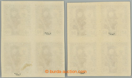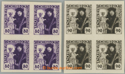 Philately. Pof.162N-163N, 80h violet and 90h black imperforated, in blocks of four; mint never hinged, value 90h with small production gum flaw, exp. Vrba (Image) (Image2)