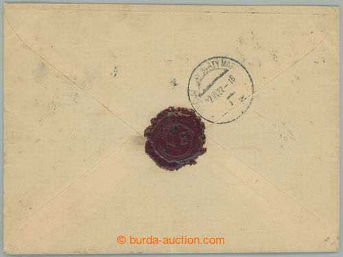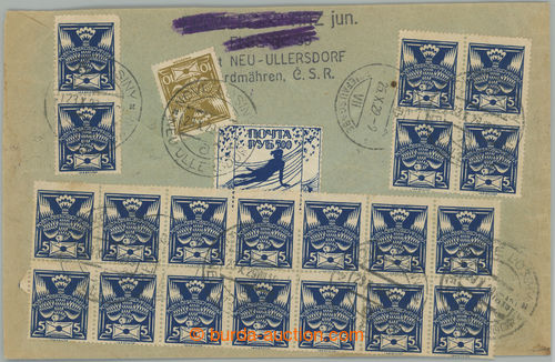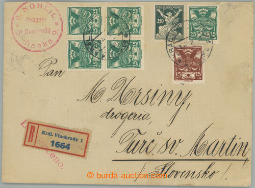 Philately. 3x heavier Reg letter sent in/at V. postal rate to Slovakia with multicolor franking Pigeon-issue and issue Chainbreaker, Pof.149 5x, 147, 161, postal-charge 3,90Kc, CDS KRAL. VINOHRADY 1/ 21.VI.22, on reverse arrival