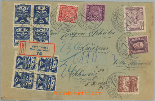 Philately. 2x heavier Reg letter to Switzerland with rich mixed franking, postal-charge for V. postal rate 8CZK paid i.a. 28 pcs of (!) stamp. Pigeon-issue 5h blue, Pof.143, CDS NOVE LOSINY 23.X.29, on reverse arrival postmark