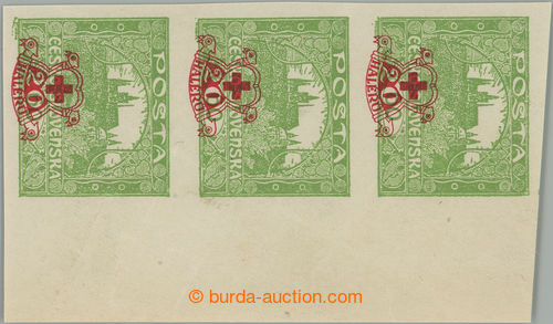 Philately. Pof.171Nc, 60h green, imperforated, vertical strip of 3 with R margin, shift added-print downward partially outside picture stamp.; mint never hinged, production bend, exp. Vrba (Image) (Image2)