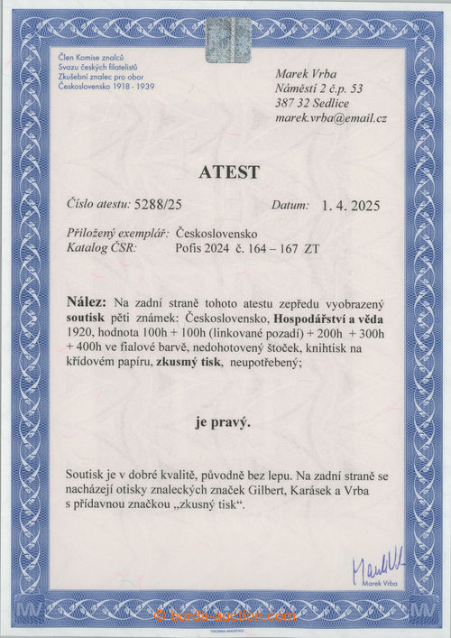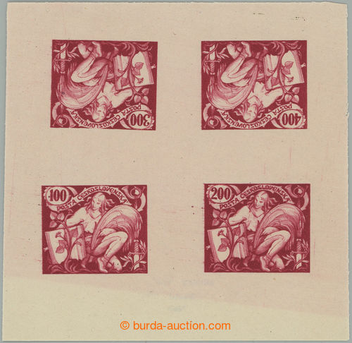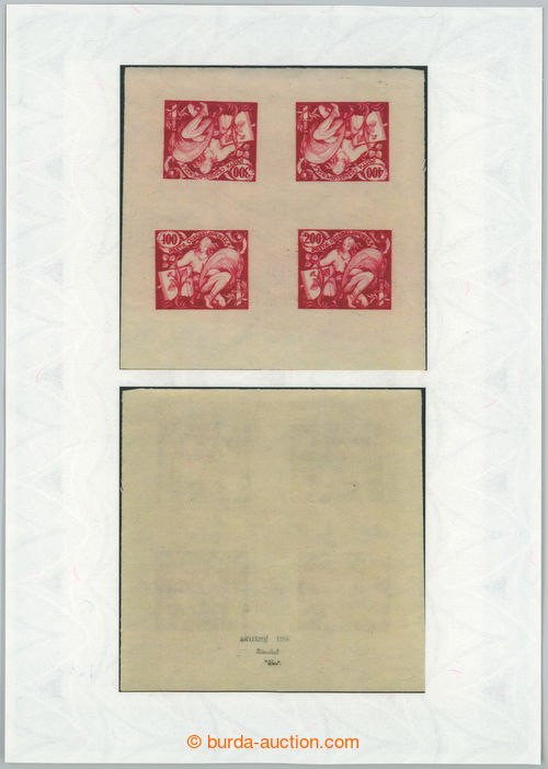 Philately. PLATE PROOF Pofis. 164-167, gravure printing protichudny joined printing 4 values 100, 200, 300 and 400h in dark red color on stamp paper with gum, wide margins; superb, Vrba certificate, exp. Kar (Image) (Image2)