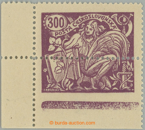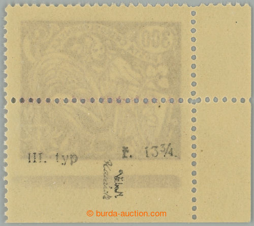 Philately. Pof.175A, 300h violet, L the bottom corner piece, type III with line perforation 13¾, with perf flaw - shift lower line perf to center picture; mint never hinged, exp. Vrba, Karasek (Image) (Image2)