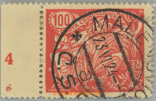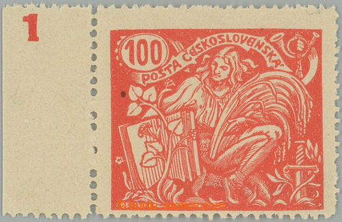 Philately. Pof.173A plate number, 100h red, type III., line perforation 13¾, L marginal piece with plate number 1; mint never hinged, small finger-print, exp. Vrba, Gilbert, rare stamps with plate numbers in this issue! (Image) (Image2)